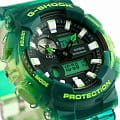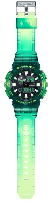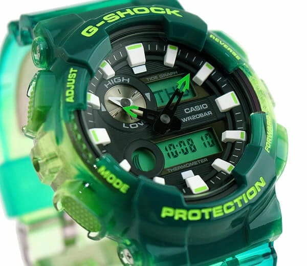 Ударопрочные, мужские часы с термометром Casio G-Shock GAX-100MSA-3A, электронный механизм с высокой точностью. Класс водозащиты: 200 метров, позволит плавать, нырять и заниматься другими водными видами спорта. Корпус часов изготовлен из пластика, прозрачного цвета.