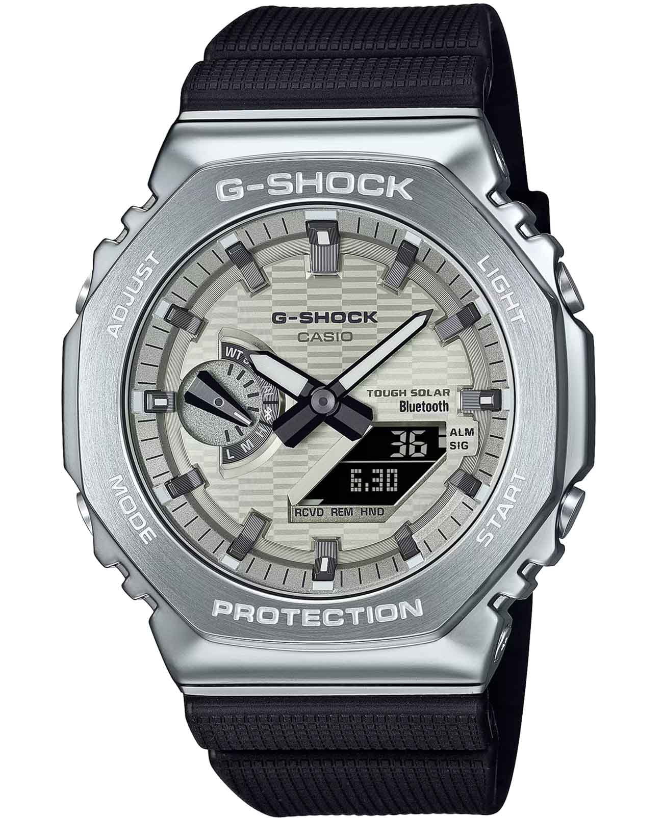 Мужские Casio G-Shock GBM-2100A-8B — это технологичный аксессуар, сочетающий в себе устойчивость к внешним воздействиям и высокую точность. Корпус модели выполнен из пластика и нержавеющей стали, что придаёт ей прочность и устойчивость к царапинам. Корпус имеет размеры 44,4х49,3мм, а его вес составляет 72 г. Защиту механизма обеспечивает минеральное стеклоМинеральное стеклоМинеральное стекло представляет собой искусственно выращенный минерал кварца. Такое стекло отличается особой устойчивостью к повреждениям и царапинам. Уступает по некоторым качествам сапфировому стеклу., устойчивое к повреждениям. Браслет выполнен из пластика со стандартной застежкой. Часы оснащены функцией Bluetooth, которая подключается к смартфону, обеспечивая автоматическую синхронизацию времени и простоту настройки. Система поддерживает 38 часовых поясов, включая всемирное координированное время, и автоматически переключается на летнее время. Функциональность модели включает секундомерСекундомерСекундоме́р — прибор, способный измерять интервалы времени с точностью до долей секунды. с точностью до 0,01 секунды, таймерТаймерОтсчитывает секунды в обратном направлении в заданном интервале времени. обратного отсчёта (до 60 минут), будильникБудильникБуди́льник — часы, в заданный момент времени подающие звуковой, световой и/или в редких случаях другой сигнал., светодиодная подсветкаСветодиодная подсветкаСветодиодная или LED-подсветка обеспечивает появление яркого холодного свечения за счёт LED-элементов - маленьких лампочек. Они потребляют минимальное количество энергии, чаще всего можно встретить 1 светодиод, в нижней части циферблата. и полный автоматический календарь до 2099 года. Водонепроницаемость 200 бар позволяет использовать модель при плавании и других водных активностях без глубокого погружения. Эти часы станут универсальным аксессуаром для тех, кто ценит сочетание стиля, функциональности и надёжности — идеальный выбор для повседневной носки и активного образа жизни.