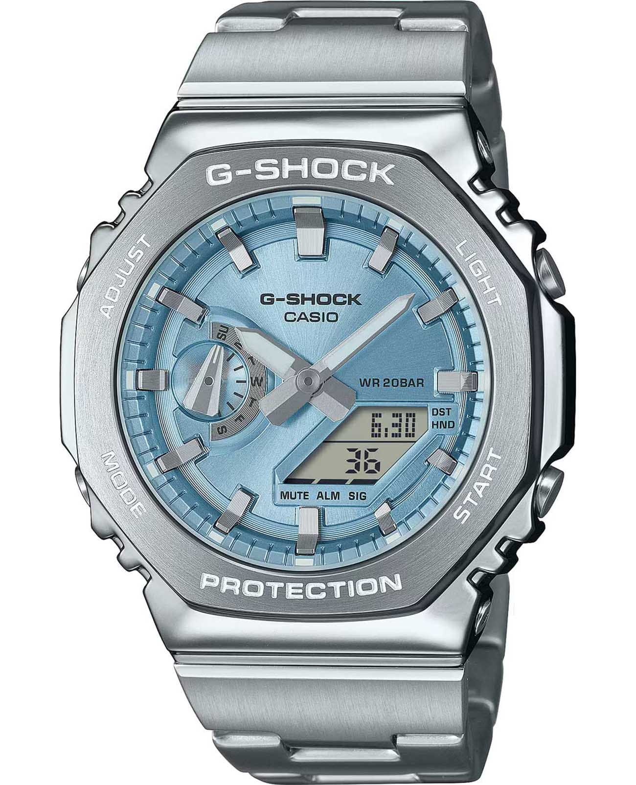 Японские ударопрочныеУдаропрочный корпусМеханизм заключён в корпус, выполненный из современных материалов, устойчивых к ударам, механическим повреждениям и падению с высоты: инновационный пластик, карбон, нержавеющая сталь, титан. мужские часы-хронографХронографФункция позволяет измерять отрезки времени с особой точностью: часы, минуты, секунды. Верным признаком хронографа является наличие на циферблате 3 дополнительных окошек-счётчиков. Casio G-Shock GM-2110D-2A в стальном корпусе. Минеральное стеклоМинеральное стеклоМинеральное стекло представляет собой искусственно выращенный минерал кварца. Такое стекло отличается особой устойчивостью к повреждениям и царапинам. Уступает по некоторым качествам сапфировому стеклу. устойчивое к появлению царапин, обладающее высокой прозрачностью. Сверхмощная двойная подсветка. При нажатии на кнопку подсветки циферблат часов освещает светодиод, а также отдельно подсвечивается цифровой дисплей. На стрелки часов нанесено NeobriteПодсветка NeobriteИспользование светонакопительных составов на основе сульфида цинка или алюмината стронция, яркий свет можно наблюдать на протяжении 6-10 часов после «зарядки» часов около источника света.-покрытие. Полный автокалендарь (до 2099 года). Включение/выключение звукового сигнала нажатия кнопки. 12/24-часовой формат времени. Мировое время Мировое время Полезное часовое усложнение, отображающее время в основных городах и известных областях по всему миру, оно связано с часовыми поясами, удобно для путешественников и бизнесменов. 31 часовой пояс (48 городов + всемирное координированное время), переход на летнее время вкл./выкл. СекундомерСекундомерСекундоме́р — прибор, способный измерять интервалы времени с точностью до долей секунды.. ТаймерТаймерОтсчитывает секунды в обратном направлении в заданном интервале времени.. 5 ежедневных будильников. Почасовой сигнал времени. Класс водозащиты: 200 метров, позволит плавать, нырять и заниматься другими водными видами спорта. Стальной браслет на раскладной застёжкеРаскладная застёжкаТакой тип застёжки используется только на браслетах из металла. Она никогда не раскрывается полностью, происходит разделение на 2 и более частей. Раскладывающая застёжка снизит вероятность потери часов к минимуму..