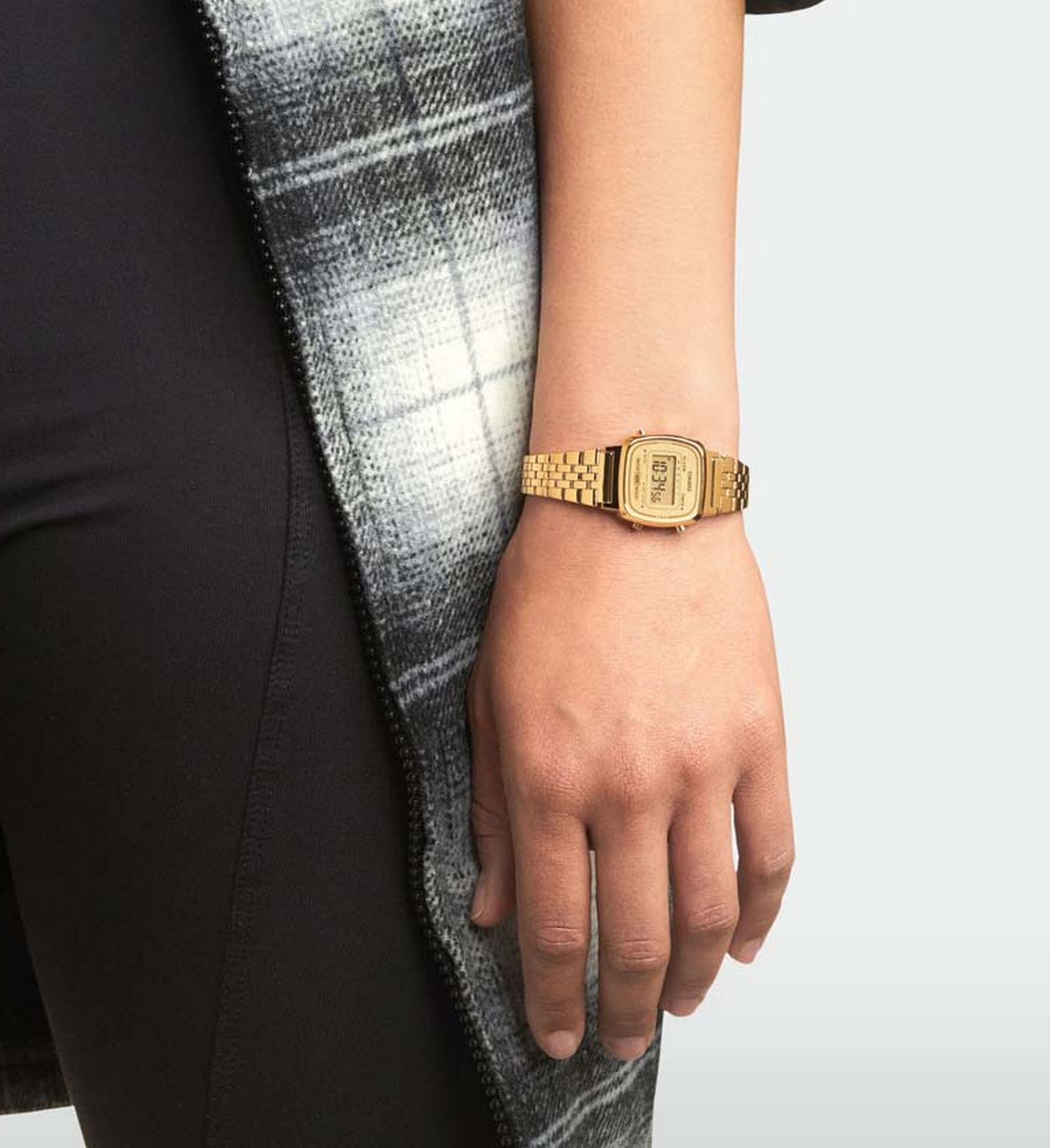 Женские электронные часы. Оснащены функциями: секундомера, таймера, календаря и подсветки. Корпус - Пластиковый; Стекло - Пластик; Водозащита - 30 м. (WR 30); Материал ремешка - Нержавеющая сталь, PVD покрытие; Цвет ремешка - Золотистый; Цвет циферблата - Золотой.