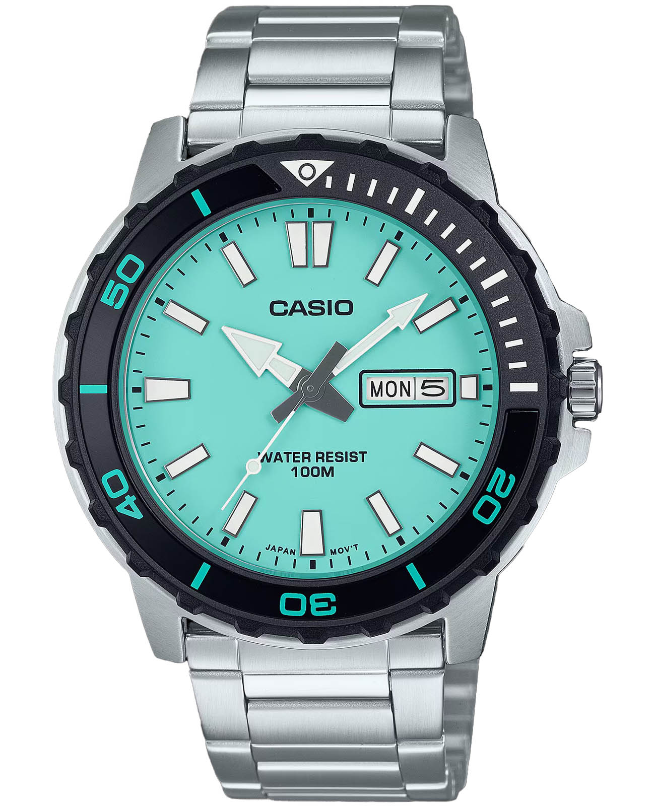Casio MTD-125D-2A2 – стильные мужские часы, идеально подходящие для активного образа жизни. Корпус диаметром 46,5 × 45,6 × 10,4 мм выполнен из нержавеющей стали, что гарантирует прочность и долговечность. Бирюзовый циферблат защищён минеральным стекломМинеральное стеклоМинеральное стекло представляет собой искусственно выращенный минерал кварца. Такое стекло отличается особой устойчивостью к повреждениям и царапинам. Уступает по некоторым качествам сапфировому стеклу., устойчивым к царапинам и механическим повреждениям. Часы оснащены кварцевым механизмом с высокой точностью хода и функцией отображения дня недели и даты, где день недели доступен на английском и испанском языках. Браслет из нержавеющей стали дополнен раскладной застёжкойРаскладная застёжкаТакой тип застёжки используется только на браслетах из металла. Она никогда не раскрывается полностью, происходит разделение на 2 и более частей. Раскладывающая застёжка снизит вероятность потери часов к минимуму., обеспечивающей удобную фиксацию на запястье. Водонепроницаемость 10 бар (100 метров) делает модель надёжным спутником для плавания и других водных активностей.