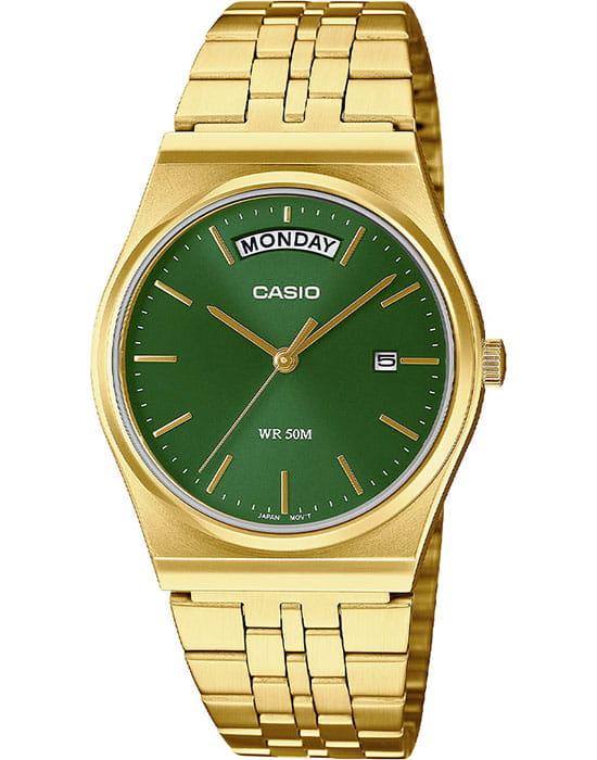 Casio Collection MTP-B146G-3A — мужские часы в лаконичном классическом исполнении. Корпус изготовлен из нержавеющей стали с IP-покрытиемIP-покрытиеМетод ионного напыления. Демонстрирует повышенную устойчивость к истиранию, окислению и химическим веществам. Под воздействием высокого давления и температуры около 1500°C молекулы металла надёжно соединяются с частицами корпуса часов. и имеет сбалансированные размеры, обеспечивающие комфортную посадку на запястье.
