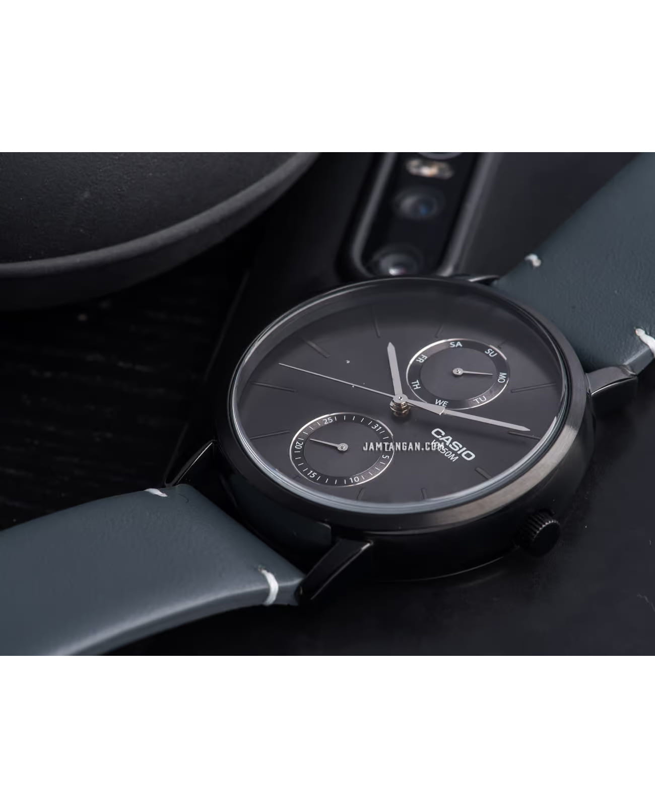 Японские мужские часы с минеральным стекломМинеральное стеклоМинеральное стекло представляет собой искусственно выращенный минерал кварца. Такое стекло отличается особой устойчивостью к повреждениям и царапинам. Уступает по некоторым качествам сапфировому стеклу. Casio Collection MTP-B310BL-1A, кварцевый механизм с высокой точностью. Корпус часов изготовлен из стали с IP-покрытиемIP-покрытиеМетод ионного напыления. Демонстрирует повышенную устойчивость к истиранию, окислению и химическим веществам. Под воздействием высокого давления и температуры около 1500°C молекулы металла надёжно соединяются с частицами корпуса часов.. Метки в виде штрихов. Число и день недели вынесены на отдельные циферблаты. Батарейка рассчитана на 3 года.  Рифленая заводная головка. Класс водозащиты: 50 метров, позволит защитить корпус от случайных брызг или капель дождя. Кожаный ремешок на стандартной застёжке.