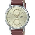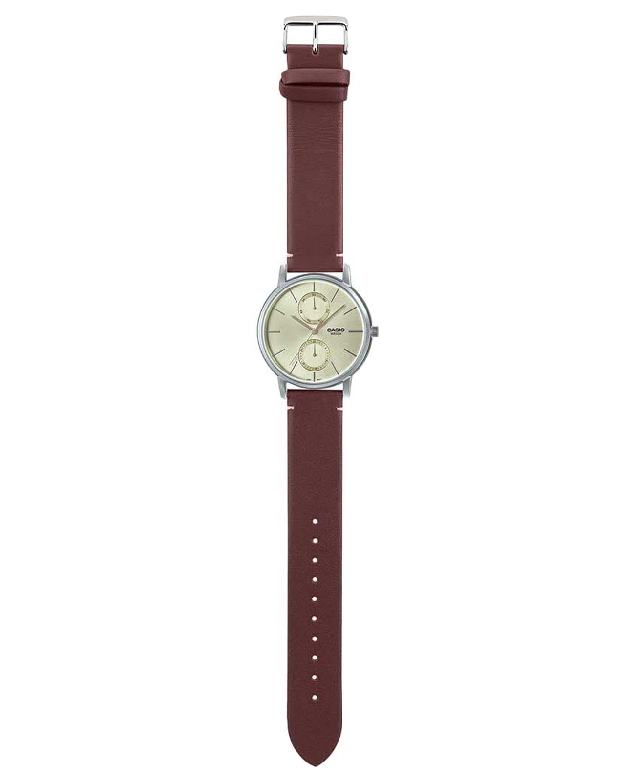 Японские мужские часы с минеральным стекломМинеральное стеклоМинеральное стекло представляет собой искусственно выращенный минерал кварца. Такое стекло отличается особой устойчивостью к повреждениям и царапинам. Уступает по некоторым качествам сапфировому стеклу. Casio Collection MTP-B310L-9A, кварцевый механизм с высокой точностью. Корпус часов изготовлен из стали. Метки в виде штрихов. Число и день недели вынесены на отдельные циферблаты. Батарейка рассчитана на 3 года.  Рифленая заводная головка. Класс водозащиты: 50 метров, позволит защитить корпус от случайных брызг или капель дождя. Кожаный ремешок на стандартной застёжке.