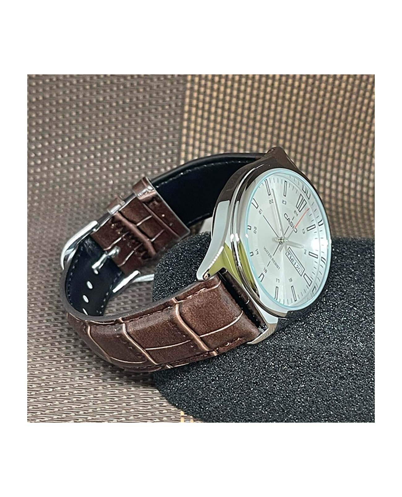 Японские мужские кварцевые часы с минеральным стекломМинеральное стеклоМинеральное стекло представляет собой искусственно выращенный минерал кварца. Такое стекло отличается особой устойчивостью к повреждениям и царапинам. Уступает по некоторым качествам сапфировому стеклу. Casio Collection MTP-V006L-7C, кварцевый механизм с высокой точностью. Корпус и браслет часов изготовлен из нержавеющей стали. 12-ти и 24-х часовой формат времени. Циферблат с метками в виде штрихов выполнен по технологии Sunray (солнечные лучи). Рифленая заводная головка. Класс водозащиты: 30 метров, позволит защитить корпус от случайных брызг или капель дождя. Кожаный ремешок на стандартной застежке.