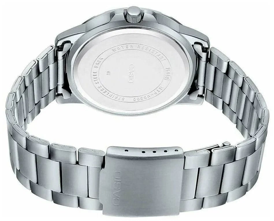Японские мужские часы с минеральным стекломМинеральное стеклоМинеральное стекло представляет собой искусственно выращенный минерал кварца. Такое стекло отличается особой устойчивостью к повреждениям и царапинам. Уступает по некоторым качествам сапфировому стеклу. Casio Collection MTP-VD300D-2E, кварцевый механизм с высокой точностью. Корпус часов изготовлен из стали. Люминесцентная подсветкаЛюминесцентное покрытиеПозволяет считывать показания времени в темноте. Производители наносят на стрелки, часовые индексы, безель или поверхность циферблата светонакопительный состав, дающий холодное свечение.. Браслет с раскладной застёжкойРаскладная застёжкаТакой тип застёжки используется только на браслетах из металла. Она никогда не раскрывается полностью, происходит разделение на 2 и более частей. Раскладывающая застёжка снизит вероятность потери часов к минимуму..