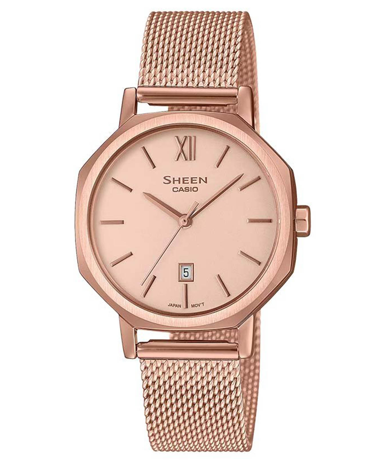 Японские женские часы Casio Sheen SHE-4554PGM-4AUEF, кварцевый механизм с высокой точностью. Корпус выполнен из нержавеющей стали. Окошко даты в положении 6 часов. Класс водозащиты: 50 метров, позволит защитить корпус от случайных брызг или капель дождя. Стальной браслет миланского плетения на раскладной застёжкеРаскладная застёжкаТакой тип застёжки используется только на браслетах из металла. Она никогда не раскрывается полностью, происходит разделение на 2 и более частей. Раскладывающая застёжка снизит вероятность потери часов к минимуму..