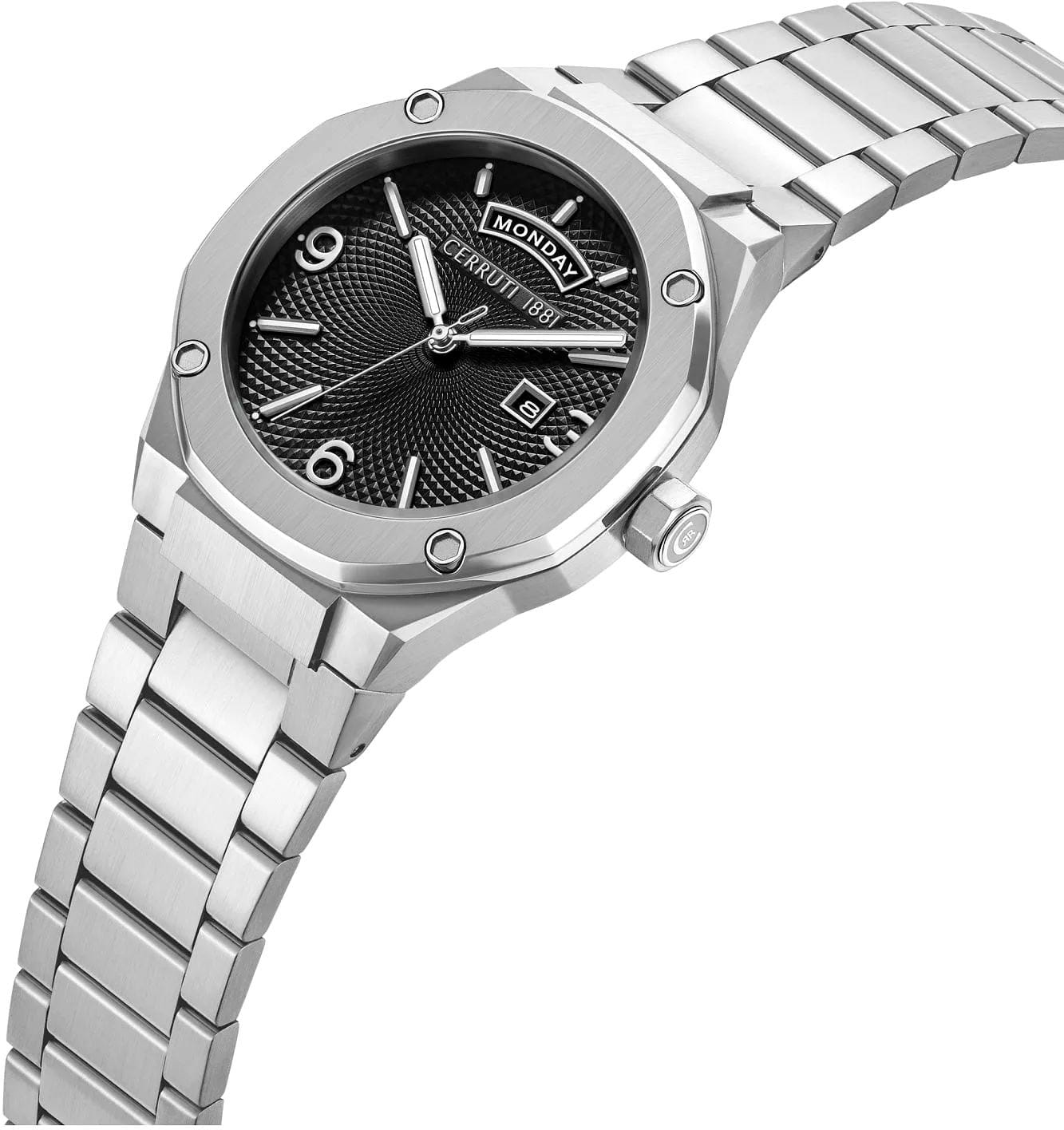 Cerruti 1881 CIWGH0084701 — утончённые мужские часы, в которых классика и современная геометрия нашли безупречный баланс. Стальной корпус с восьмигранным безелемБезельВнешний ободок, закрепляющий стекло. В спортивных часах так называется поворотное кольцо с делениями на циферблате, выполняет роль таймера – замеряет отрезки времени на шкале. Неподвижный безель – элемент декора. Однонаправленно вращающийся безель на дайверских часах позволяет фиксировать моменты погружения и выныривания на поверхность. подчёркивает архитектурную точность форм, а глубокий циферблат с гильошированным узором придаёт модели выразительную глубину. Индикаторы дня недели и даты оформлены в элегантных окнах на «12» и «3 часах», обеспечивая визуальную симметрию и удобство считывания. Прочные стрелки покрыты люминесцентным покрытиемЛюминесцентное покрытиеПозволяет считывать показания времени в темноте. Производители наносят на стрелки, часовые индексы, безель или поверхность циферблата светонакопительный состав, дающий холодное свечение., что гарантирует отличную читаемость даже в темноте. Циферблат защищён надёжным минеральным стекломМинеральное стеклоМинеральное стекло представляет собой искусственно выращенный минерал кварца. Такое стекло отличается особой устойчивостью к повреждениям и царапинам. Уступает по некоторым качествам сапфировому стеклу., устойчивым к царапинам, а стальной браслет фиксируется удобной застёжкой «бабочка»Застёжка "бабочка"Такой вид застёжки дополняется предохранителями, помогающими избежать случайного раскрытия браслета. Обладают изящным исполнением. , обеспечивающей комфорт и безопасность при носке. Строгая форма и продуманные детали делают эту модель идеальным выбором для мужчины, ценящего сдержанную роскошь и точность швейцарского стиля.