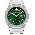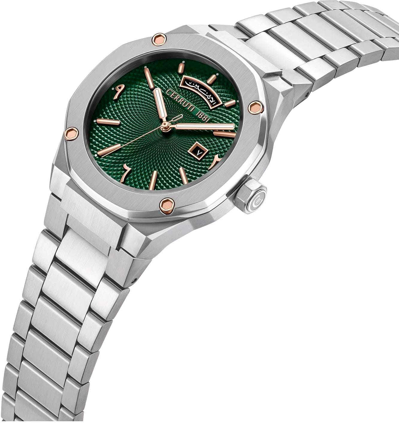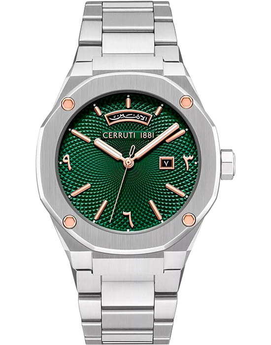 Cerruti 1881 CIWGH0084803 — утончённые мужские часы, в которых классика и современная геометрия нашли безупречный баланс. Стальной корпус с восьмигранным безелемБезельВнешний ободок, закрепляющий стекло. В спортивных часах так называется поворотное кольцо с делениями на циферблате, выполняет роль таймера – замеряет отрезки времени на шкале. Неподвижный безель – элемент декора. Однонаправленно вращающийся безель на дайверских часах позволяет фиксировать моменты погружения и выныривания на поверхность. подчёркивает архитектурную точность форм, а глубокий циферблат с гильошированным узором придаёт модели выразительную глубину. Индикаторы дня недели и даты оформлены в элегантных окнах на «12» и «3 часах», обеспечивая визуальную симметрию и удобство считывания. Прочные стрелки покрыты люминесцентным покрытиемЛюминесцентное покрытиеПозволяет считывать показания времени в темноте. Производители наносят на стрелки, часовые индексы, безель или поверхность циферблата светонакопительный состав, дающий холодное свечение., что гарантирует отличную читаемость даже в темноте. Циферблат защищён надёжным минеральным стекломМинеральное стеклоМинеральное стекло представляет собой искусственно выращенный минерал кварца. Такое стекло отличается особой устойчивостью к повреждениям и царапинам. Уступает по некоторым качествам сапфировому стеклу., устойчивым к царапинам, а стальной браслет фиксируется удобной застёжкой «бабочка»Застёжка "бабочка"Такой вид застёжки дополняется предохранителями, помогающими избежать случайного раскрытия браслета. Обладают изящным исполнением. , обеспечивающей комфорт и безопасность при носке. Строгая форма и продуманные детали делают эту модель идеальным выбором для мужчины, ценящего сдержанную роскошь и точность швейцарского стиля.