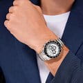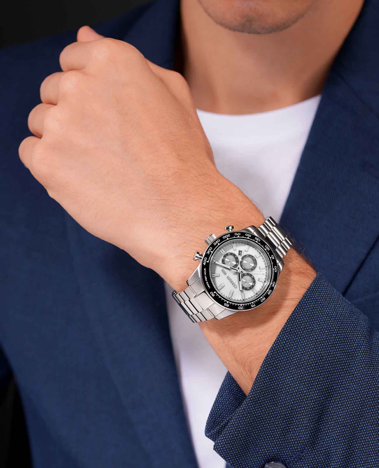 Французские мужские часы-хронографХронографФункция позволяет измерять отрезки времени с особой точностью: часы, минуты, секунды. Верным признаком хронографа является наличие на циферблате 3 дополнительных окошек-счётчиков. Cerruti 1881 Turchino CIWGI0028302, кварцевый механизм с высокой точностью. Минеральное стеклоМинеральное стеклоМинеральное стекло представляет собой искусственно выращенный минерал кварца. Такое стекло отличается особой устойчивостью к повреждениям и царапинам. Уступает по некоторым качествам сапфировому стеклу. устойчивое к мелким механическим повреждениям. Корпус часов изготовлен из стали. БезельБезельВнешний ободок, закрепляющий стекло. В спортивных часах так называется поворотное кольцо с делениями на циферблате, выполняет роль таймера – замеряет отрезки времени на шкале. Неподвижный безель – элемент декора. Однонаправленно вращающийся безель на дайверских часах позволяет фиксировать моменты погружения и выныривания на поверхность. из нержавеющей стали и кермики. Циферблат выполнен с метками в виде штрихов. Окошко даты находится в положении между 4 и 5 часами. Стрелки и метки с люминесцентным покрытиемЛюминесцентное покрытиеПозволяет считывать показания времени в темноте. Производители наносят на стрелки, часовые индексы, безель или поверхность циферблата светонакопительный состав, дающий холодное свечение.. Класс водозащиты: 100 метров, позволит плавать, нырять и заниматься другими водными видами спорта. Стальной на застёжке-бабочке с кнопкамиЗастёжка "бабочка"Такой вид застёжки дополняется предохранителями, помогающими избежать случайного раскрытия браслета. Обладают изящным исполнением. .