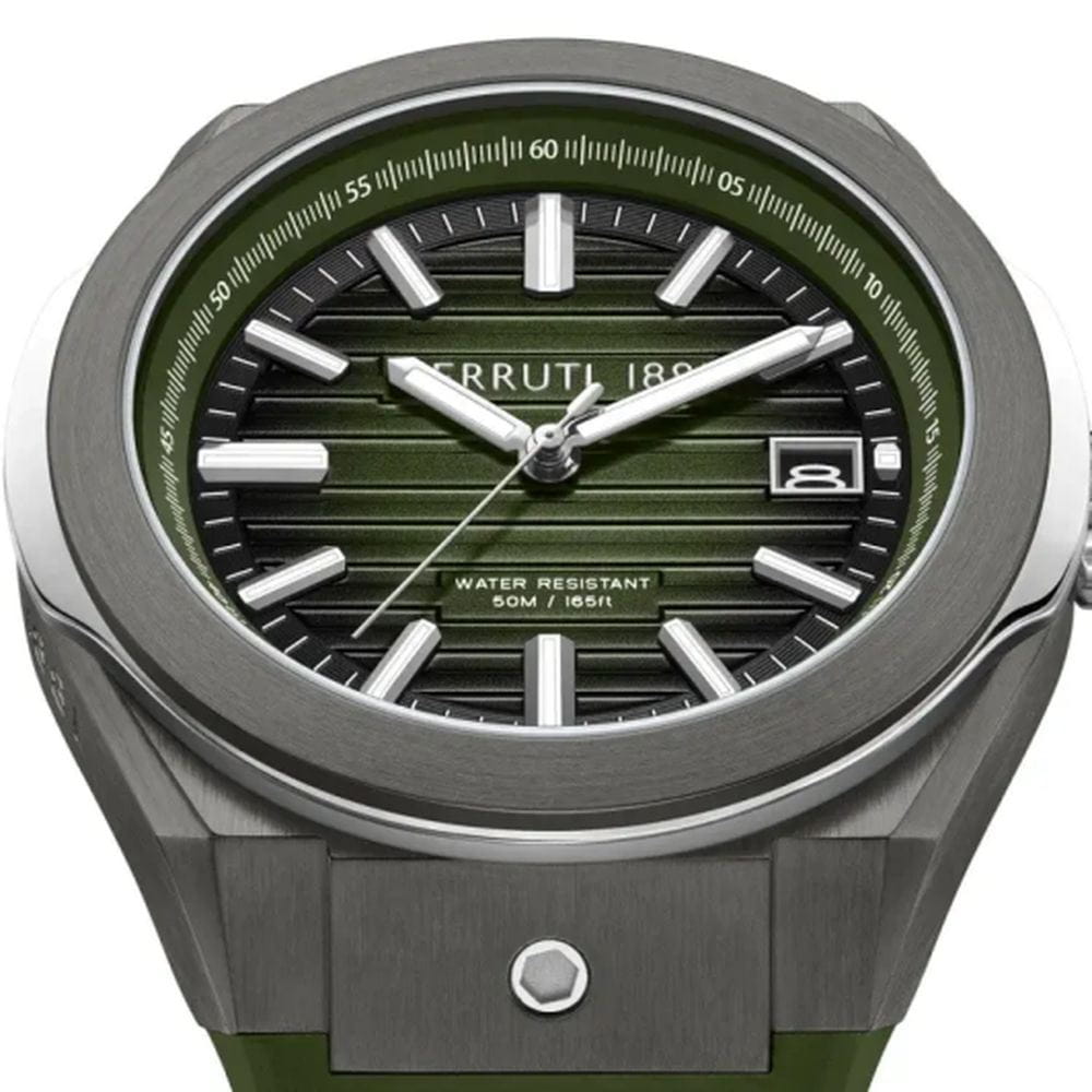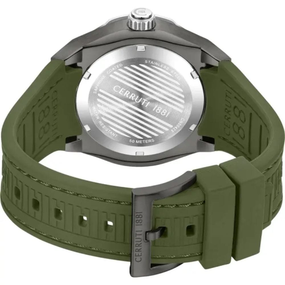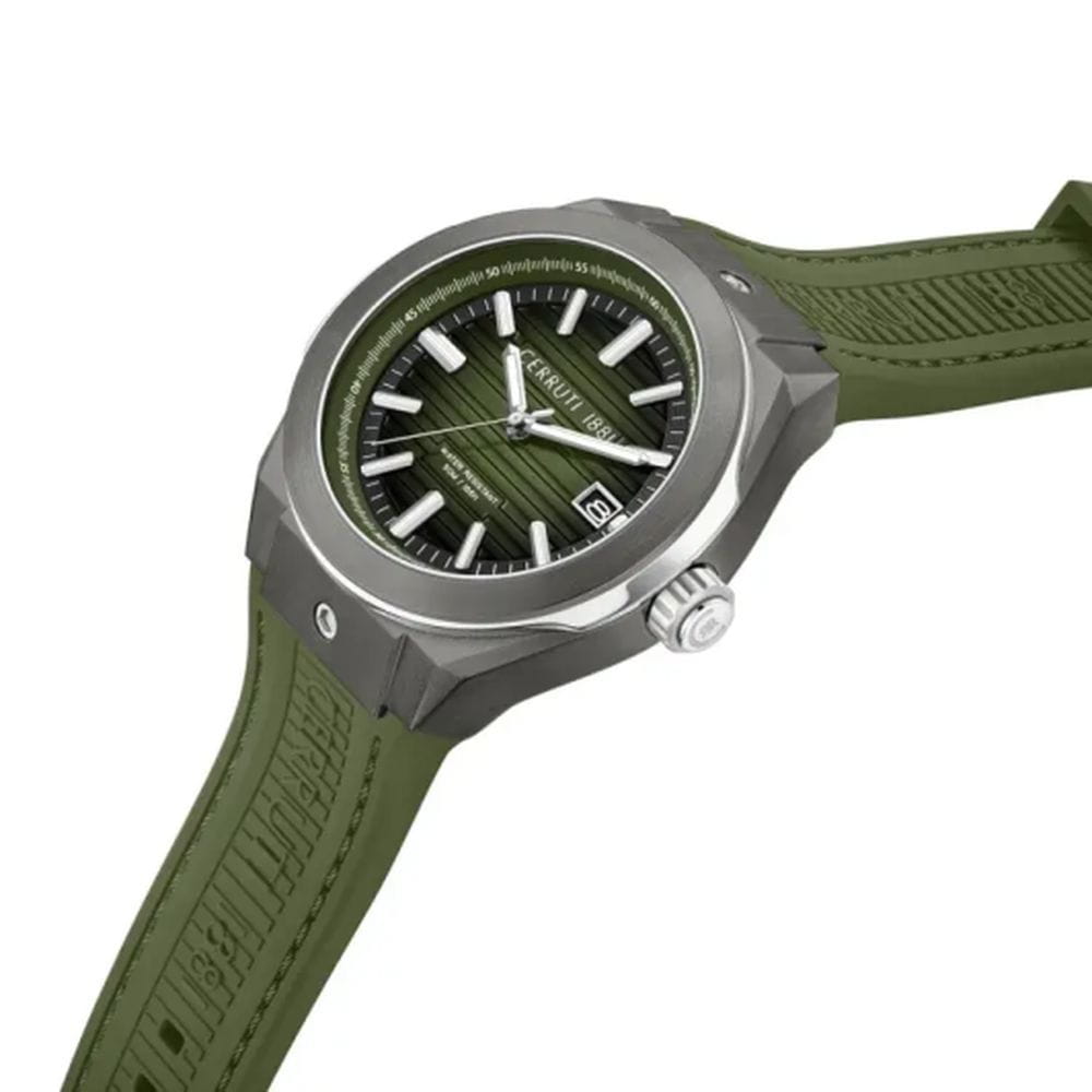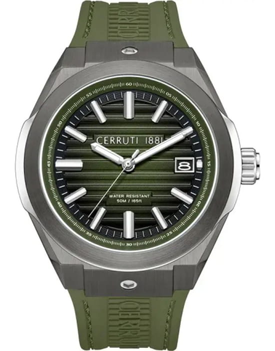 Cerruti 1881 CIWGN0042902 — выразительные мужские часы с характером, созданные в духе современной урбанистики. Массивный корпус из нержавеющей стали с серым матовым PVD-покрытиемPVDУльтратонкое покрытие наносится в технике вакуумного напыления, сочетает в себе нитрид титана особой прочности со слоем золота или оксида хрома. Несёт в себе декоративную или защитную функцию. и геометричным безелемБезельВнешний ободок, закрепляющий стекло. В спортивных часах так называется поворотное кольцо с делениями на циферблате, выполняет роль таймера – замеряет отрезки времени на шкале. Неподвижный безель – элемент декора. Однонаправленно вращающийся безель на дайверских часах позволяет фиксировать моменты погружения и выныривания на поверхность. с PVD-покрытиемPVDУльтратонкое покрытие наносится в технике вакуумного напыления, сочетает в себе нитрид титана особой прочности со слоем золота или оксида хрома. Несёт в себе декоративную или защитную функцию. подчёркивает силу и уверенность дизайна. Глубокий зелёный циферблат с горизонтальной текстурой дополняют чёткие метки и стрелки с люминесцентным покрытиемЛюминесцентное покрытиеПозволяет считывать показания времени в темноте. Производители наносят на стрелки, часовые индексы, безель или поверхность циферблата светонакопительный состав, дающий холодное свечение., обеспечивающие отличную читаемость даже в сумерках. Функциональное оформление включает окно даты на позиции «3 часов», подчёркивающую практичный характер модели. Прочное минеральное стеклоМинеральное стеклоМинеральное стекло представляет собой искусственно выращенный минерал кварца. Такое стекло отличается особой устойчивостью к повреждениям и царапинам. Уступает по некоторым качествам сапфировому стеклу. защищает циферблат, а эластичный силиконовый ремешок в тон циферблату обеспечивает комфорт и современный спортивный акцент. Cerruti 1881 — стильный аксессуар для мужчин, ценящих надёжность, функциональность и безупречное чувство стиля.