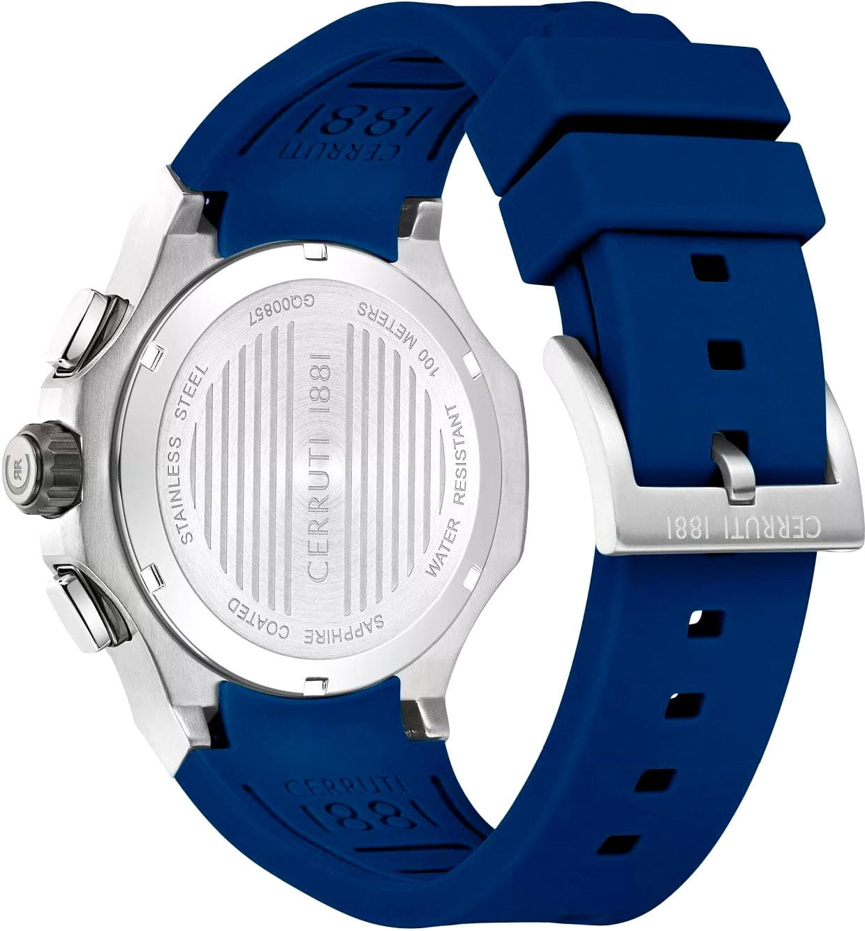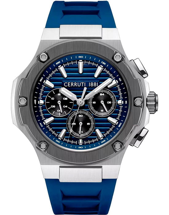 Cerruti 1881 CIWGQ0085702 — выразительные мужские часы с современным архитектурным дизайном, сочетающие спортивную мощь и итальянскую утончённость. Корпус из нержавеющей стали с фактурным шестигранным безелемБезельВнешний ободок, закрепляющий стекло. В спортивных часах так называется поворотное кольцо с делениями на циферблате, выполняет роль таймера – замеряет отрезки времени на шкале. Неподвижный безель – элемент декора. Однонаправленно вращающийся безель на дайверских часах позволяет фиксировать моменты погружения и выныривания на поверхность. с ip-покрытиемIP-покрытиеМетод ионного напыления. Демонстрирует повышенную устойчивость к истиранию, окислению и химическим веществам. Под воздействием высокого давления и температуры около 1500°C молекулы металла надёжно соединяются с частицами корпуса часов. подчёркивает индустриальный характер модели, а насыщенный синий циферблат с тремя счётчиками хронографаХронографФункция позволяет измерять отрезки времени с особой точностью: часы, минуты, секунды. Верным признаком хронографа является наличие на циферблате 3 дополнительных окошек-счётчиков. создаёт динамичную композицию. Контрастные стрелки и метки с люминесцентным покрытиемЛюминесцентное покрытиеПозволяет считывать показания времени в темноте. Производители наносят на стрелки, часовые индексы, безель или поверхность циферблата светонакопительный состав, дающий холодное свечение. обеспечивают превосходную читаемость, а прочное минеральное стеклоМинеральное стеклоМинеральное стекло представляет собой искусственно выращенный минерал кварца. Такое стекло отличается особой устойчивостью к повреждениям и царапинам. Уступает по некоторым качествам сапфировому стеклу. надёжно защищает циферблат. Мягкий силиконовый ремешок с интегрированным дизайном гармонирует с цветовой палитрой корпуса и обеспечивает комфортное прилегание к запястью. Cerruti 1881 — это стильный союз технологий, функциональности и узнаваемого итальянского характера, идеально подходящий для активного и уверенного мужчины.