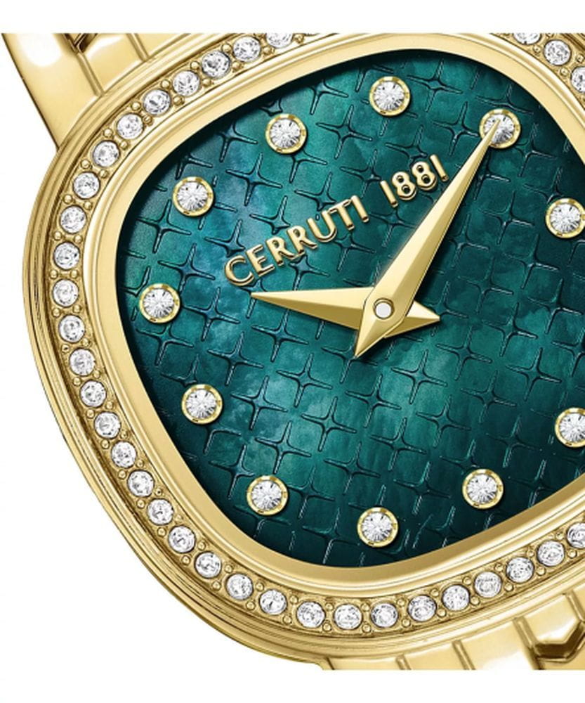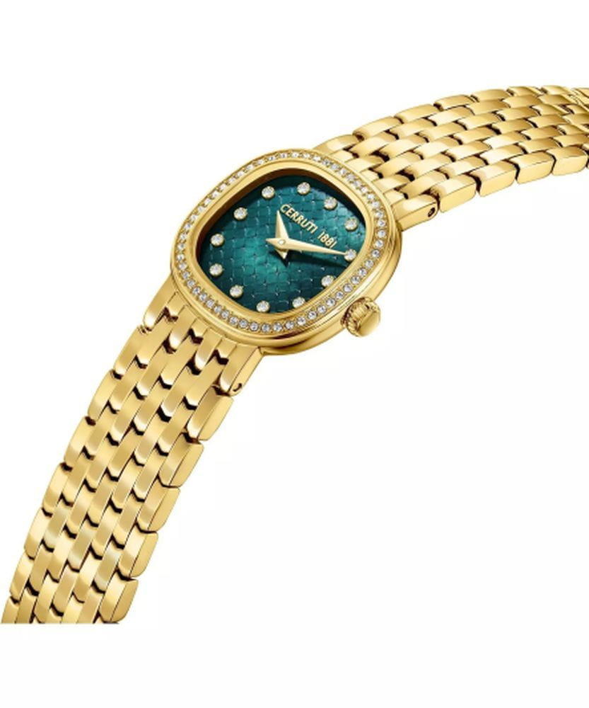 Cerruti 1881 CIWLG0072907 — утончённые женские часы, воплощающие роскошь и классическую итальянскую элегантность. Корпус в изящной круглой форме с мягко скруглёнными линиями покрыт благородным золотым IP-покрытиемIP-покрытиеМетод ионного напыления. Демонстрирует повышенную устойчивость к истиранию, окислению и химическим веществам. Под воздействием высокого давления и температуры около 1500°C молекулы металла надёжно соединяются с частицами корпуса часов., а безельБезельВнешний ободок, закрепляющий стекло. В спортивных часах так называется поворотное кольцо с делениями на циферблате, выполняет роль таймера – замеряет отрезки времени на шкале. Неподвижный безель – элемент декора. Однонаправленно вращающийся безель на дайверских часах позволяет фиксировать моменты погружения и выныривания на поверхность., украшенный сияющими кристаллами, придаёт модели особый блеск и изысканность. Глубокий зелёный циферблат с перламутровым переливом и индексами в виде кристаллов создаёт эффект ювелирного украшения. Прочное минеральное стеклоМинеральное стеклоМинеральное стекло представляет собой искусственно выращенный минерал кварца. Такое стекло отличается особой устойчивостью к повреждениям и царапинам. Уступает по некоторым качествам сапфировому стеклу. надёжно защищает поверхность от повреждений, а браслет из нержавеющей стали в тон корпуса оснащён застёжкой «бабочка»Застёжка "бабочка"Такой вид застёжки дополняется предохранителями, помогающими избежать случайного раскрытия браслета. Обладают изящным исполнением. , обеспечивающей элегантное прилегание и комфорт при ношении. Cerruti 1881 — это воплощение женственности, блеска и утончённого вкуса, идеально подходящее для особых случаев и повседневной элегантности.