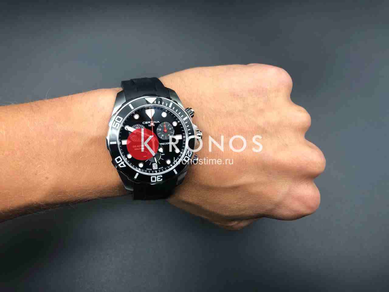 Наручные часы отличаются привлекательным дизайном, чёрный циферблат имеет крупную индикацию времени, расставлены акценты красного цвета. Модель комплектуется кварцевым механизмом ETA Precidrive™Precidrive™Инновационный кварцевый механизм Certina. Часы, оснащённые этим швейцарским калибром, приравниваются к точности к сертифицированным хронометрам, точность хода составляет +/-10 секунд в год., отличающимся отменной точностью хода. Вращающийся безельБезельВнешний ободок, закрепляющий стекло. В спортивных часах так называется поворотное кольцо с делениями на циферблате, выполняет роль таймера – замеряет отрезки времени на шкале. Неподвижный безель – элемент декора. Однонаправленно вращающийся безель на дайверских часах позволяет фиксировать моменты погружения и выныривания на поверхность. имеет чёрное PVD-покрытиеPVDУльтратонкое покрытие наносится в технике вакуумного напыления, сочетает в себе нитрид титана особой прочности со слоем золота или оксида хрома. Несёт в себе декоративную или защитную функцию., защищающее от царапин. Сапфировое стекло с антибликовой обработкой. Силиконовый ремешок. Индикатор EOLEOLПредставляет собой систему, уведомляющую владельца часов о необходимости замены элемента питания. За 2 недели до полного разряда батарейки секундная стрелка перестаёт ходить чётко и начинает перепрыгивать на 3-4 деления.. Секундомер, хронографХронографФункция позволяет измерять отрезки времени с особой точностью: часы, минуты, секунды. Верным признаком хронографа является наличие на циферблате 3 дополнительных окошек-счётчиков., окошко даты. Диаметр корпуса: 43 мм.