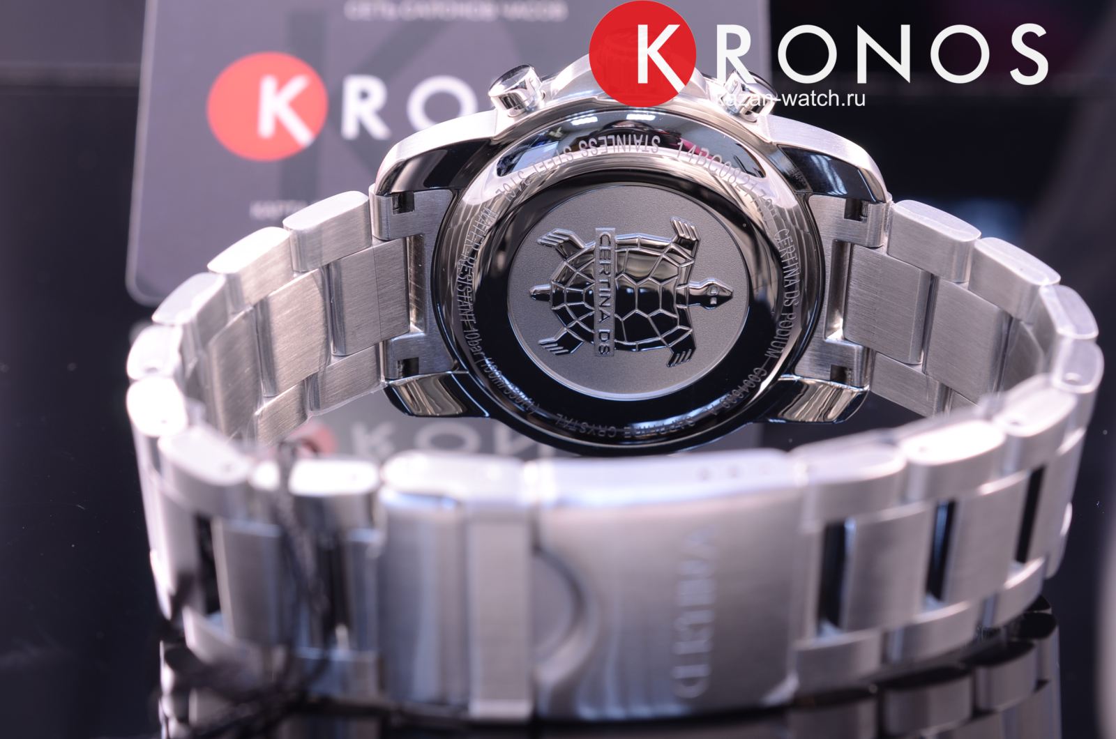 Часы Certina – это воплощение высочайшей точности и надежности часов, система DS расшифровывается Double Security; "двойная надежность". Беспрекословная точность и надежность, использование сложных технологий, инновационный подход в сочетании с традициями создания хронографов, которые марка пронесла через десятилетия, – все это позволяет компании предоставлять элитные, роскошные и стильные часы. На обратной стороне нанесено изображение черепахи в знак долговечности. Задняя крышка с повышенной прочностью, два кольца с уплотнением на заводной головке.