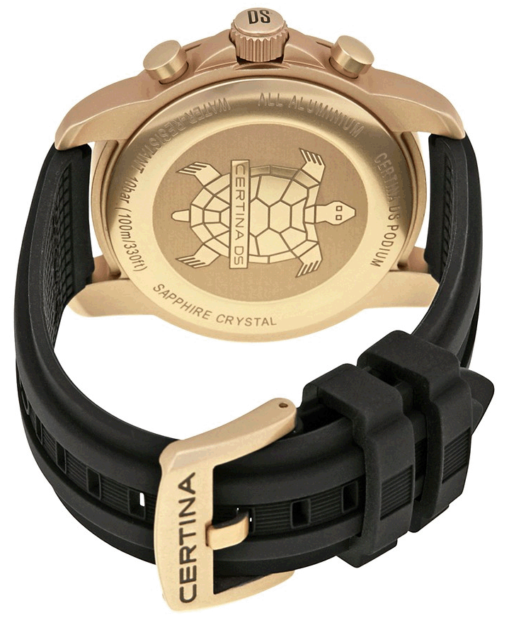 Каучуковый ремешок обеспечивает комфортное ношение. Швейцарский кварцевый механизм G10.962 BF Precidrive™Precidrive™Инновационный кварцевый механизм Certina. Часы, оснащённые этим швейцарским калибром, приравниваются к точности к сертифицированным хронометрам, точность хода составляет +/-10 секунд в год. отличается высокой точностью хода. Ультралёгкий алюминиевый корпус. Сапфировое стекло. ХронографХронографФункция позволяет измерять отрезки времени с особой точностью: часы, минуты, секунды. Верным признаком хронографа является наличие на циферблате 3 дополнительных окошек-счётчиков., календарь, GMTGMTОтображение времени второго часового пояса.Такая функция особенно актуальна для путешественников и бизнесменов,которые общаются с людьми из разных стран,теперь вы всегда будете знать,какой час у вашего партнёра или близкого человека., секундомер, тахиметрТахиметрРазмеченная шкала, располагается на ободке или безеле часов. Тахиметр позволяет рассчитать скорость на определённом участке пути, расстояние измеряется в километрах или милях..