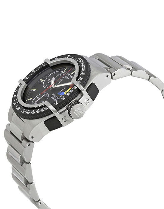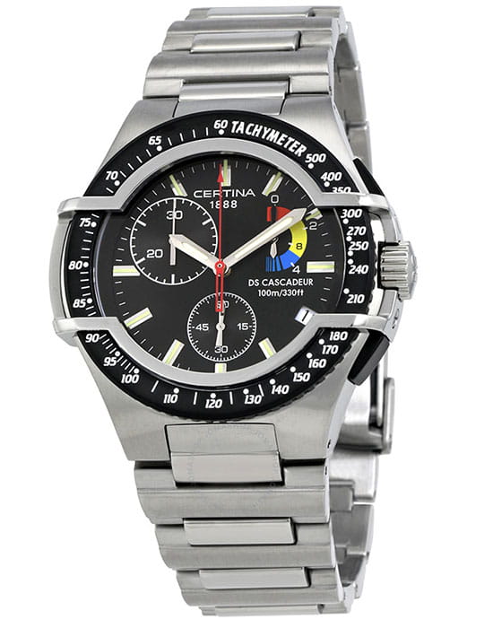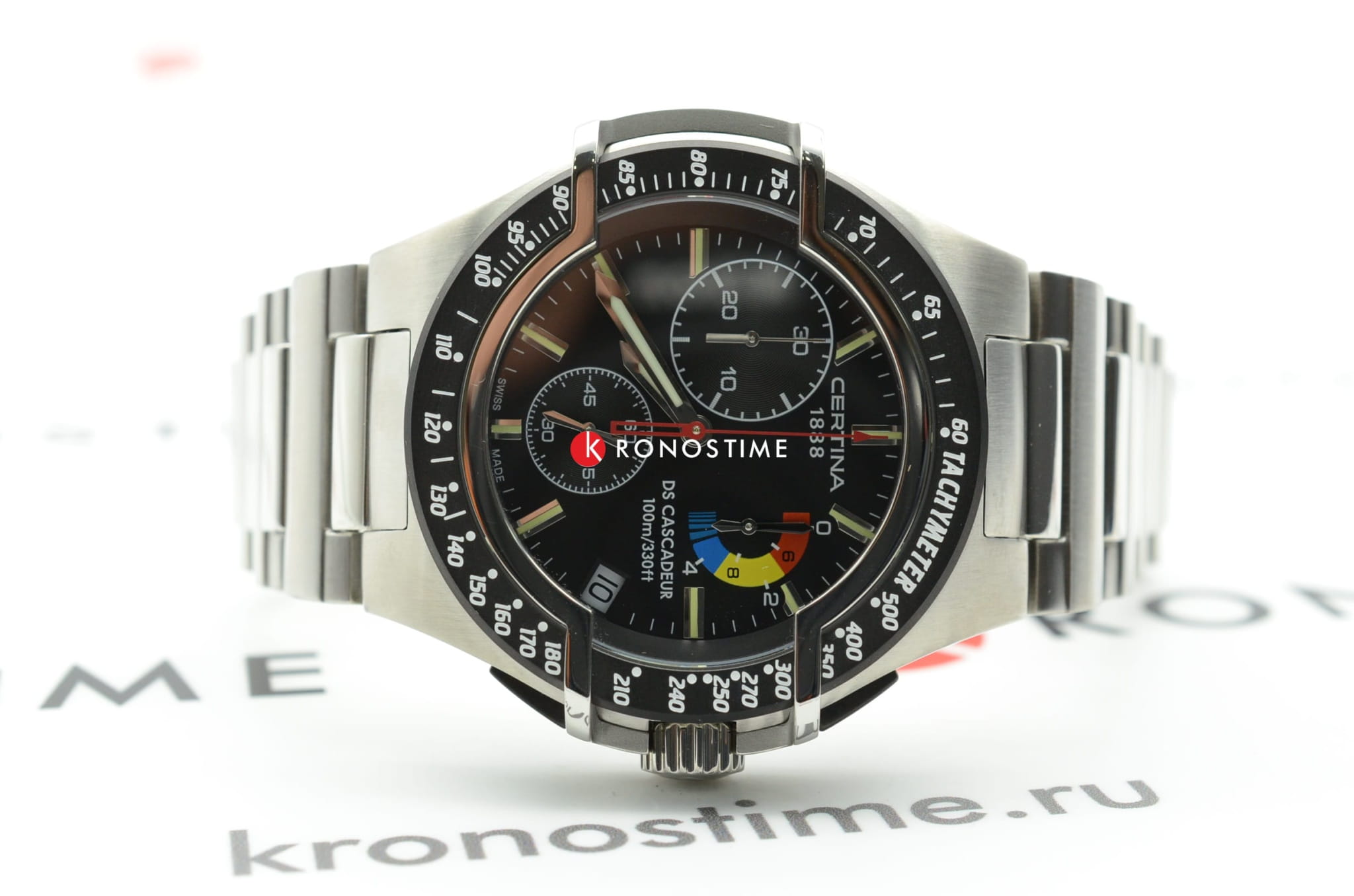 Надёжный корпус основан на концепции Двойной Надёжности DSDS ConceptDouble Security Concept, обозначает двойную надёжность и безупречную точность часов Certina. Двойная система защиты подразумевает обеспечение максимальной устойчивости к ударам и высоких показателей водонепроницаемости., выполнен из стали 316L с частичным PVD-финишемPVDУльтратонкое покрытие наносится в технике вакуумного напыления, сочетает в себе нитрид титана особой прочности со слоем золота или оксида хрома. Несёт в себе декоративную или защитную функцию.. Модель оснащена тахиметромТахиметрРазмеченная шкала, располагается на ободке или безеле часов. Тахиметр позволяет рассчитать скорость на определённом участке пути, расстояние измеряется в километрах или милях., секундомером, календарём, хронографомХронографФункция позволяет измерять отрезки времени с особой точностью: часы, минуты, секунды. Верным признаком хронографа является наличие на циферблате 3 дополнительных окошек-счётчиков.. Работу часов обеспечивает швейцарский кварцевый калибр ETA G10.211.