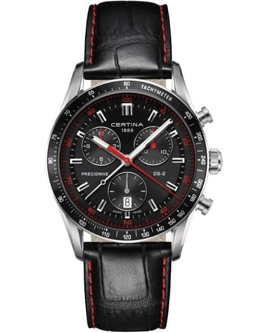 CERTINA C024.447.16.051.03 DS 2 Quartz Chronograph - мужские кварцевые наручные часы. Корпус этих часов среднего размера (41 мм) и выполнен из нержавеющей стали L316 металлического цвета. Модель CERTINA C024.447.16.051.03 DS 2 Quartz Chronograph имеет устойчивое к царапинам сапфировое стекло, ремешок из натуральной кожи черного цвета, черный циферблат. Калибр механизма: ETA 251.264. Класс водозащиты: 100 м / 10 АТМ (разрешается плавание и ныряние без акваланга). Дополнительные функции и особенности: отображение числа, хронограф (секундомер), тахиметр. Полная заводская комплектация CERTINA: оригинальные часы, фирменная коробка, инструкция, сервисная книжка, кассовый и товарный чеки. Международная гарантия 2 года. Производство и сборка: Швейцария