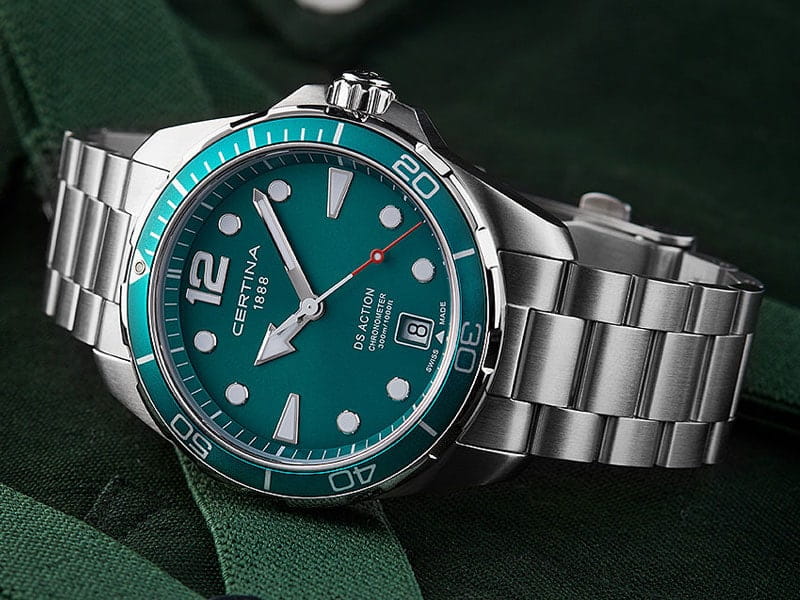 Это превосходная модель в серебристо-зелёной расцветке для тех, кто не готов соглашаться на меньшее. Наручные часы отличаются безупречными характеристиками по всем параметрам: ударопрочный корпусУдаропрочный корпусМеханизм заключён в корпус, выполненный из современных материалов, устойчивых к ударам, механическим повреждениям и падению с высоты: инновационный пластик, карбон, нержавеющая сталь, титан. из хирургической стали 316L, устойчивое к царапинам сапфировое стекло с антибликовой поверхностью, водостойкость до 30 бар, повышенная точность хода кварцевого швейцарского калибра ETA F07.412 Precidrive™Precidrive™Инновационный кварцевый механизм Certina. Часы, оснащённые этим швейцарским калибром, приравниваются к точности к сертифицированным хронометрам, точность хода составляет +/-10 секунд в год., подтверждённая сертификатом COSCСертификат COSCОфициальный сертификат, подтверждающий то, что часы ходят с особо высокой точностью. Для получения документа часы подвергаются тестовым испытаниям, разработанным швейцарским институтом тестирования хронометров COSC. Допустимая норма для механических часов -4/+6 секунд в день, для кварцевых моделей +/- 0,07 секунд в день.. Алюминиевый вращающийся безельБезельВнешний ободок, закрепляющий стекло. В спортивных часах так называется поворотное кольцо с делениями на циферблате, выполняет роль таймера – замеряет отрезки времени на шкале. Неподвижный безель – элемент декора. Однонаправленно вращающийся безель на дайверских часах позволяет фиксировать моменты погружения и выныривания на поверхность.. Закручивающиеся кнопки, заводная головка с системой защиты, задняя крышка. Индикатор EOLEOLПредставляет собой систему, уведомляющую владельца часов о необходимости замены элемента питания. За 2 недели до полного разряда батарейки секундная стрелка перестаёт ходить чётко и начинает перепрыгивать на 3-4 деления.. Апертура даты. Застёжка с фиксатором и удлинением для дайверовУдлинение для дайверовЗастёжка с удлинением для дайверов представляет собой безопасное крепление, которое позволяет надевать часы поверх гидрокостюма. Гибкая застёжка удлиняется на 1-2 миллиметра.. Диаметр корпуса: 43 мм.