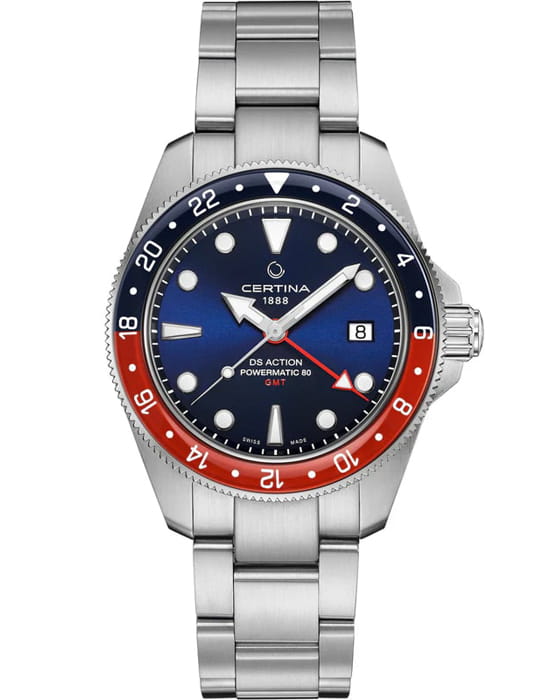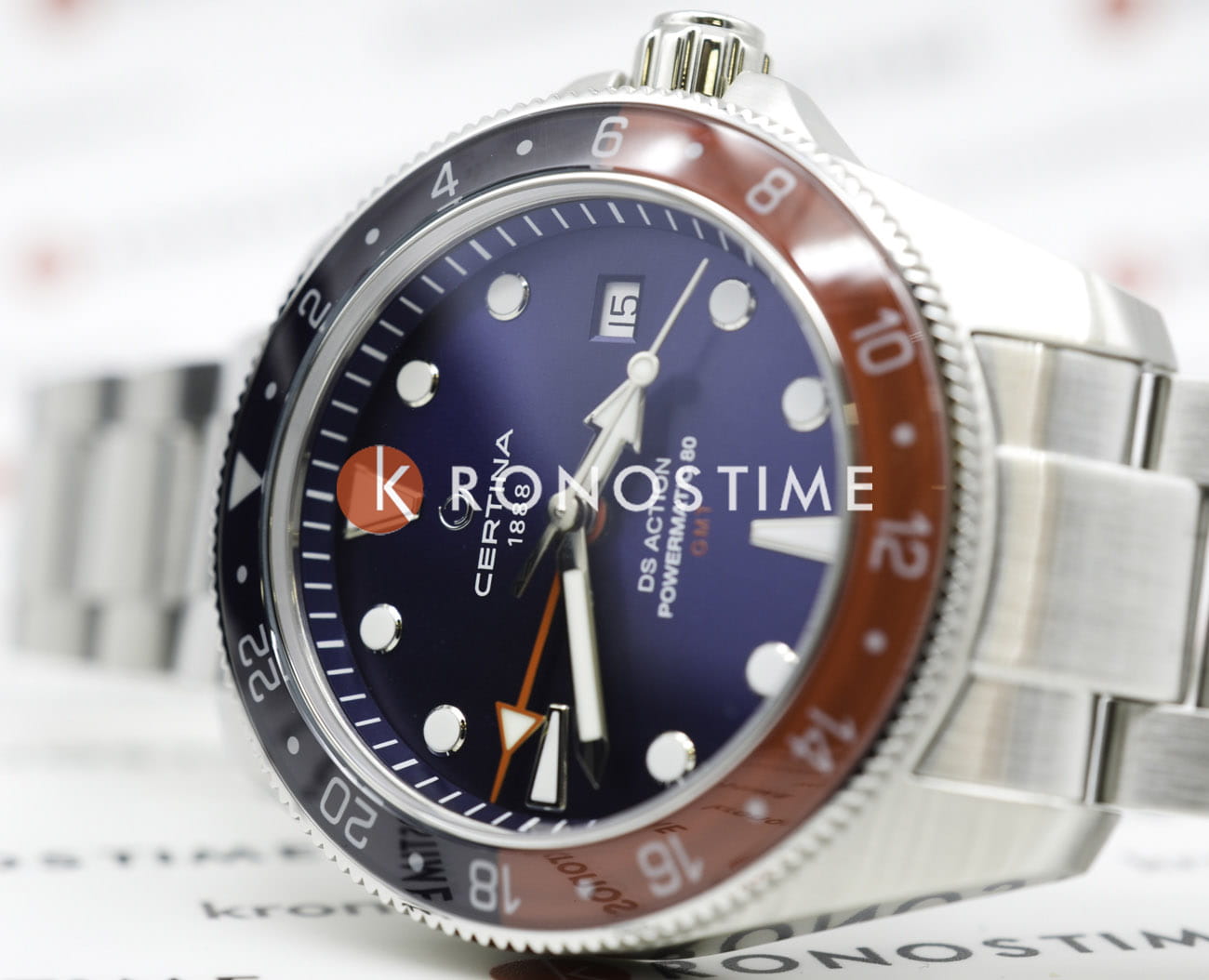 Мужские швейцарские механические часы с автоподзаводом Certina DS Action Gmt Powermatic 80 C032.929.11.041.00, механический механизм (автоматический калибр) с высокой точностью. Сапфировое стеклоСапфировое стеклоПрочный и надёжный материал из кристалла сапфира синтетического происхождения, характеризующийся особой твёрдостью и устойчивостью к царапинам и повреждениям. устойчивое к появлению царапин, обладающее высокой прозрачностью. Корпус изготовлен из нержавеющей стали. БезельБезельВнешний ободок, закрепляющий стекло. В спортивных часах так называется поворотное кольцо с делениями на циферблате, выполняет роль таймера – замеряет отрезки времени на шкале. Неподвижный безель – элемент декора. Однонаправленно вращающийся безель на дайверских часах позволяет фиксировать моменты погружения и выныривания на поверхность. из стали с сапфировым стеклом. Стрелки и метки с люминесцентным покрытиемЛюминесцентное покрытиеПозволяет считывать показания времени в темноте. Производители наносят на стрелки, часовые индексы, безель или поверхность циферблата светонакопительный состав, дающий холодное свечение.. Окошко даты находится в положении 3 часа. Класс водозащиты: 200 метров, позволит плавать, нырять и заниматься другими водными видами спорта. Стальной браслет на раскладной застёжкеРаскладная застёжкаТакой тип застёжки используется только на браслетах из металла. Она никогда не раскрывается полностью, происходит разделение на 2 и более частей. Раскладывающая застёжка снизит вероятность потери часов к минимуму..