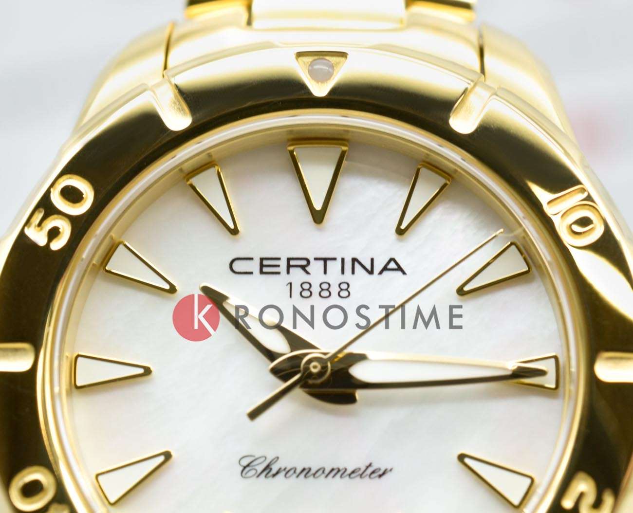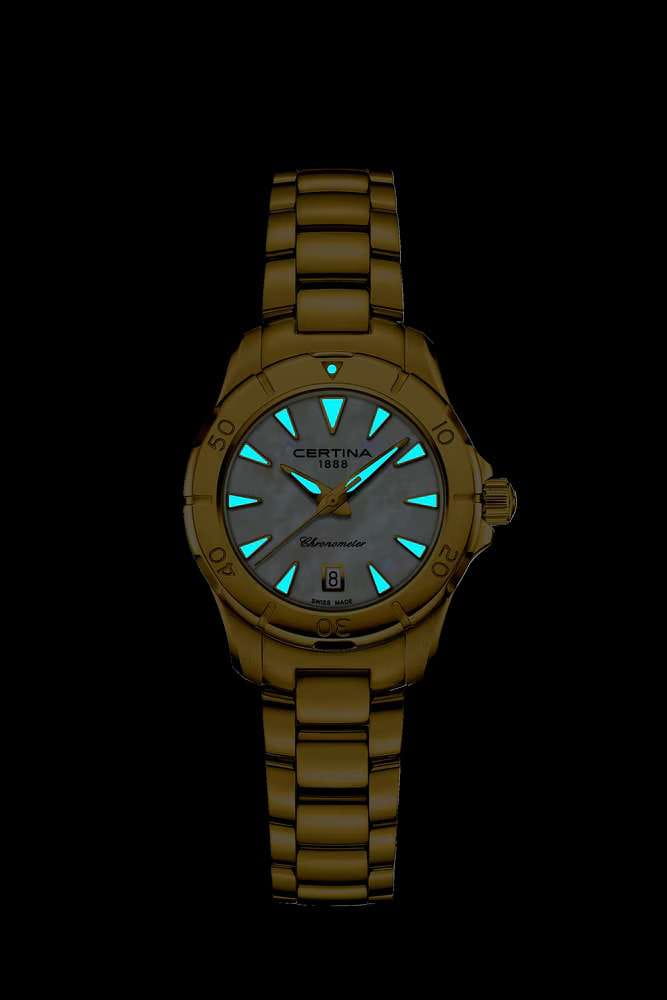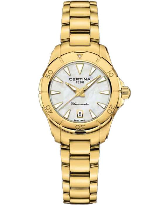 Компактный аксессуар создан по всем правилам дайверской тематики: вращающийся безельБезельВнешний ободок, закрепляющий стекло. В спортивных часах так называется поворотное кольцо с делениями на циферблате, выполняет роль таймера – замеряет отрезки времени на шкале. Неподвижный безель – элемент декора. Однонаправленно вращающийся безель на дайверских часах позволяет фиксировать моменты погружения и выныривания на поверхность., крупная индикация времени, завинчивающаяся заводная головка и задняя крышка. Стильно смотрится золотистый циферблат в сочетании с холодным блеском нержавеющей стали 316L с PVD-покрытиемPVDУльтратонкое покрытие наносится в технике вакуумного напыления, сочетает в себе нитрид титана особой прочности со слоем золота или оксида хрома. Несёт в себе декоративную или защитную функцию.. Часы оснащены швейцарским кварцевым калибром ETA F04.412 Precidrive™Precidrive™Инновационный кварцевый механизм Certina. Часы, оснащённые этим швейцарским калибром, приравниваются к точности к сертифицированным хронометрам, точность хода составляет +/-10 секунд в год., точность хода которого отмечена официальным сертификатом COSCСертификат COSCОфициальный сертификат, подтверждающий то, что часы ходят с особо высокой точностью. Для получения документа часы подвергаются тестовым испытаниям, разработанным швейцарским институтом тестирования хронометров COSC. Допустимая норма для механических часов -4/+6 секунд в день, для кварцевых моделей +/- 0,07 секунд в день.. Модель отличается максимальной водонепроницаемостью 200 метров, сапфировое стекло дополнено антибликовым покрытием. Функции: отображение даты, индикатор EOLEOLПредставляет собой систему, уведомляющую владельца часов о необходимости замены элемента питания. За 2 недели до полного разряда батарейки секундная стрелка перестаёт ходить чётко и начинает перепрыгивать на 3-4 деления.. Диаметр корпуса: 29 мм.