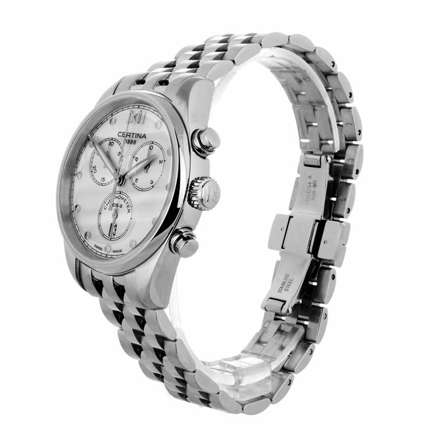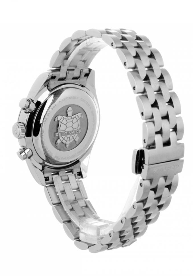 Модель имеет высокую точность хода швейцарского кварцевого калибра ETA G15.212 Precidrive™Precidrive™Инновационный кварцевый механизм Certina. Часы, оснащённые этим швейцарским калибром, приравниваются к точности к сертифицированным хронометрам, точность хода составляет +/-10 секунд в год.. Это подтверждается сертификатом COSCСертификат COSCОфициальный сертификат, подтверждающий то, что часы ходят с особо высокой точностью. Для получения документа часы подвергаются тестовым испытаниям, разработанным швейцарским институтом тестирования хронометров COSC. Допустимая норма для механических часов -4/+6 секунд в день, для кварцевых моделей +/- 0,07 секунд в день.. Система Двойной Надёжности DSDS ConceptDouble Security Concept, обозначает двойную надёжность и безупречную точность часов Certina. Двойная система защиты подразумевает обеспечение максимальной устойчивости к ударам и высоких показателей водонепроницаемости.. Стекло из сапфира с обработкой «антиблик». ХронографХронографФункция позволяет измерять отрезки времени с особой точностью: часы, минуты, секунды. Верным признаком хронографа является наличие на циферблате 3 дополнительных окошек-счётчиков., секундомер, дата, EOLEOLПредставляет собой систему, уведомляющую владельца часов о необходимости замены элемента питания. За 2 недели до полного разряда батарейки секундная стрелка перестаёт ходить чётко и начинает перепрыгивать на 3-4 деления..Корпус и браслет из стали 316L.