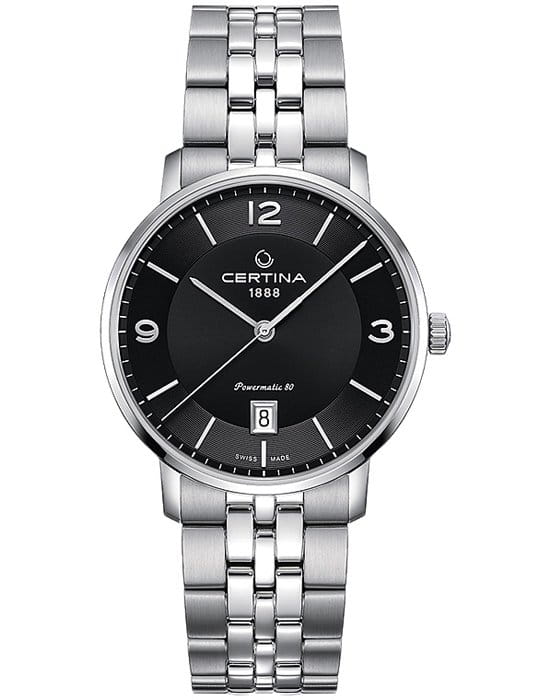 Лаконичный облик всегда будет в моде. Швейцарский автоматический калибр Powermatic 80Powermatic 80Эксклюзивный калибр от швейцарской компании ETA с увеличенным запасом хода до 80 часов за счёт удлинённой заводной пружины. Характеризуется улучшенной системой спуска со сниженным трением.. Прозрачная задняя крышка. Концепция DS ConceptDS ConceptDouble Security Concept, обозначает двойную надёжность и безупречную точность часов Certina. Двойная система защиты подразумевает обеспечение максимальной устойчивости к ударам и высоких показателей водонепроницаемости.. Стекло из сапфира. Корпус и браслет из стали 316L. Водонепроницаемость 100 метров. Апертура даты.