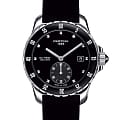 Стальной корпус дополнен керамическим безелемБезельВнешний ободок, закрепляющий стекло. В спортивных часах так называется поворотное кольцо с делениями на циферблате, выполняет роль таймера – замеряет отрезки времени на шкале. Неподвижный безель – элемент декора. Однонаправленно вращающийся безель на дайверских часах позволяет фиксировать моменты погружения и выныривания на поверхность., устойчивым к царапинам. Секундный счётчик вынесен в нижнюю часть циферблата. Чёрный каучуковый ремешок отличается мягкостью и прочностью. В основе работы – швейцарский кварцевый механизм ETA G15.211. Заводная головка декорирована кабашоном.