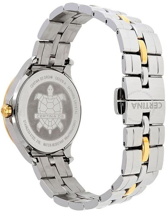 Брендовый аксессуар с компактным ударопрочным корпусомУдаропрочный корпусМеханизм заключён в корпус, выполненный из современных материалов, устойчивых к ударам, механическим повреждениям и падению с высоты: инновационный пластик, карбон, нержавеющая сталь, титан. выдержан в классическом стиле. Циферблат с перламутровой вставкой украшен 8 бриллиантами цвета Top Wesselton, перед роскошным исполнением устоять просто невозможно. Кварцевый механизм ETA F06.111. Стекло из сапфира. Корпус и браслет из стали 316L, устойчивой к коррозии. Частичное PVD-покрытиеPVDУльтратонкое покрытие наносится в технике вакуумного напыления, сочетает в себе нитрид титана особой прочности со слоем золота или оксида хрома. Несёт в себе декоративную или защитную функцию.. Концепция DS Concept DS ConceptDouble Security Concept, обозначает двойную надёжность и безупречную точность часов Certina. Двойная система защиты подразумевает обеспечение максимальной устойчивости к ударам и высоких показателей водонепроницаемости.. Водостойкость 100 метров. Отображение даты, индикатор EOLEOLПредставляет собой систему, уведомляющую владельца часов о необходимости замены элемента питания. За 2 недели до полного разряда батарейки секундная стрелка перестаёт ходить чётко и начинает перепрыгивать на 3-4 деления.. Диаметр корпуса: 30,5 мм.