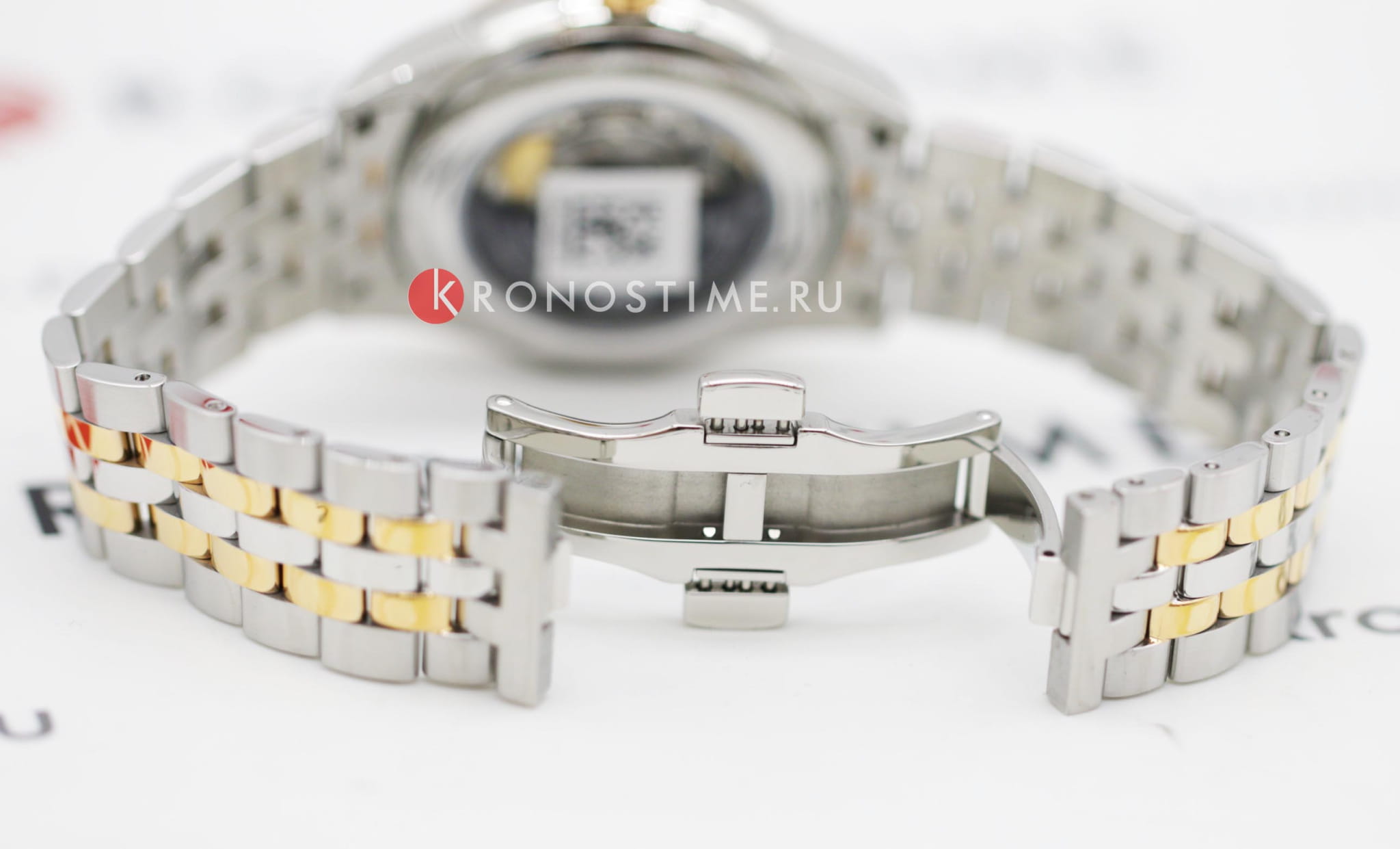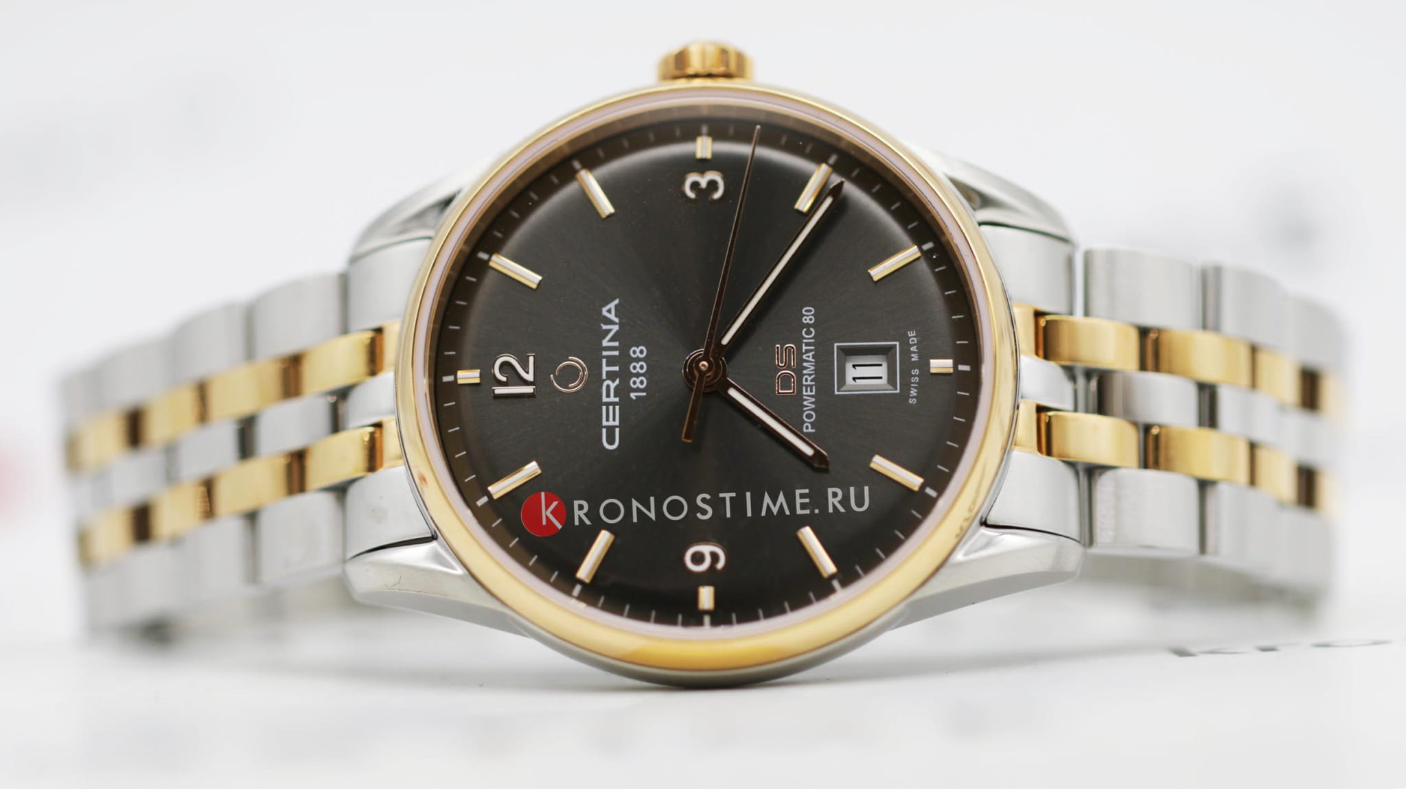 Антрацитовый циферблат дополнен стрелками и метками в золотистом цвете. Контрастное исполнение позволяет легко считывать показатели даже при мимолётном взгляде. Стильно смотрится сочетание блеска нержавеющей стали 316L и оттенок розового золота PVD-покрытияPVDУльтратонкое покрытие наносится в технике вакуумного напыления, сочетает в себе нитрид титана особой прочности со слоем золота или оксида хрома. Несёт в себе декоративную или защитную функцию.. Часы с автоподзаводом комплектуются швейцарским механизмом ETA Powermatic 80Powermatic 80Эксклюзивный калибр от швейцарской компании ETA с увеличенным запасом хода до 80 часов за счёт удлинённой заводной пружины. Характеризуется улучшенной системой спуска со сниженным трением., имеющим увеличенный резерв хода до 80 часов. Прозрачная задняя крышка – идеальный вариант для любителей прикоснуться к искусству часового мастерства. Сапфировое стекло дополнено антибликовым покрытием. В основе конструкции часов лежит концепция DSDS ConceptDouble Security Concept, обозначает двойную надёжность и безупречную точность часов Certina. Двойная система защиты подразумевает обеспечение максимальной устойчивости к ударам и высоких показателей водонепроницаемости., что гарантирует ударопрочность модели. В нижней части циферблата расположено окошко даты. Диаметр корпуса: 40 мм.
