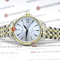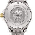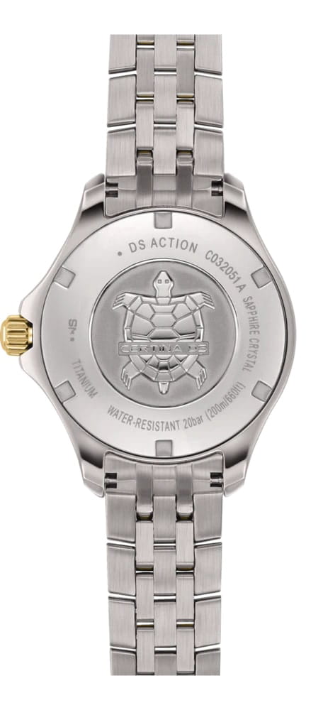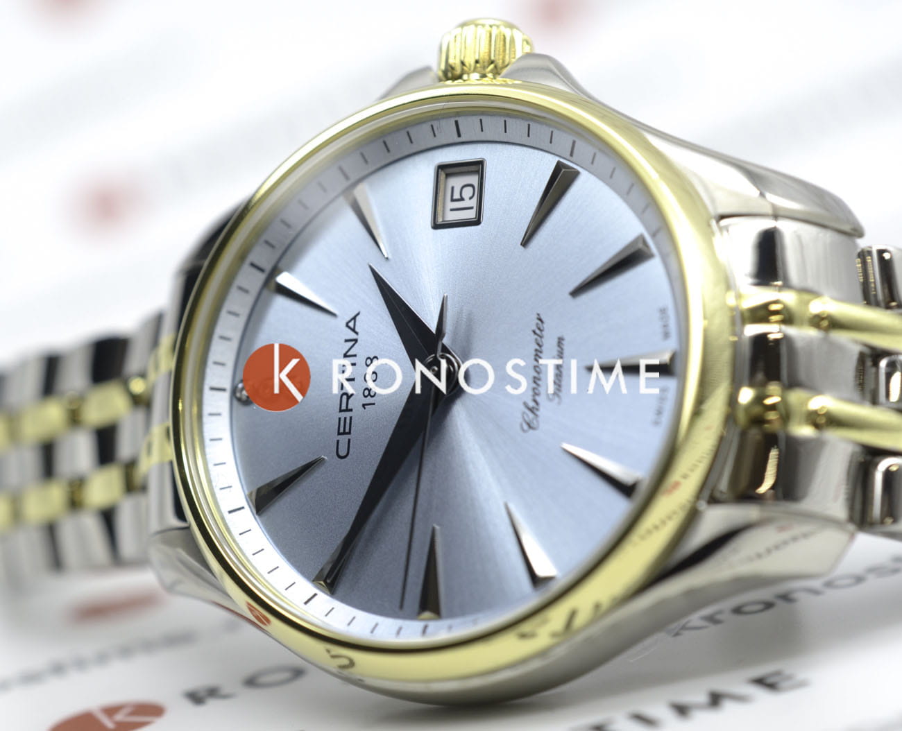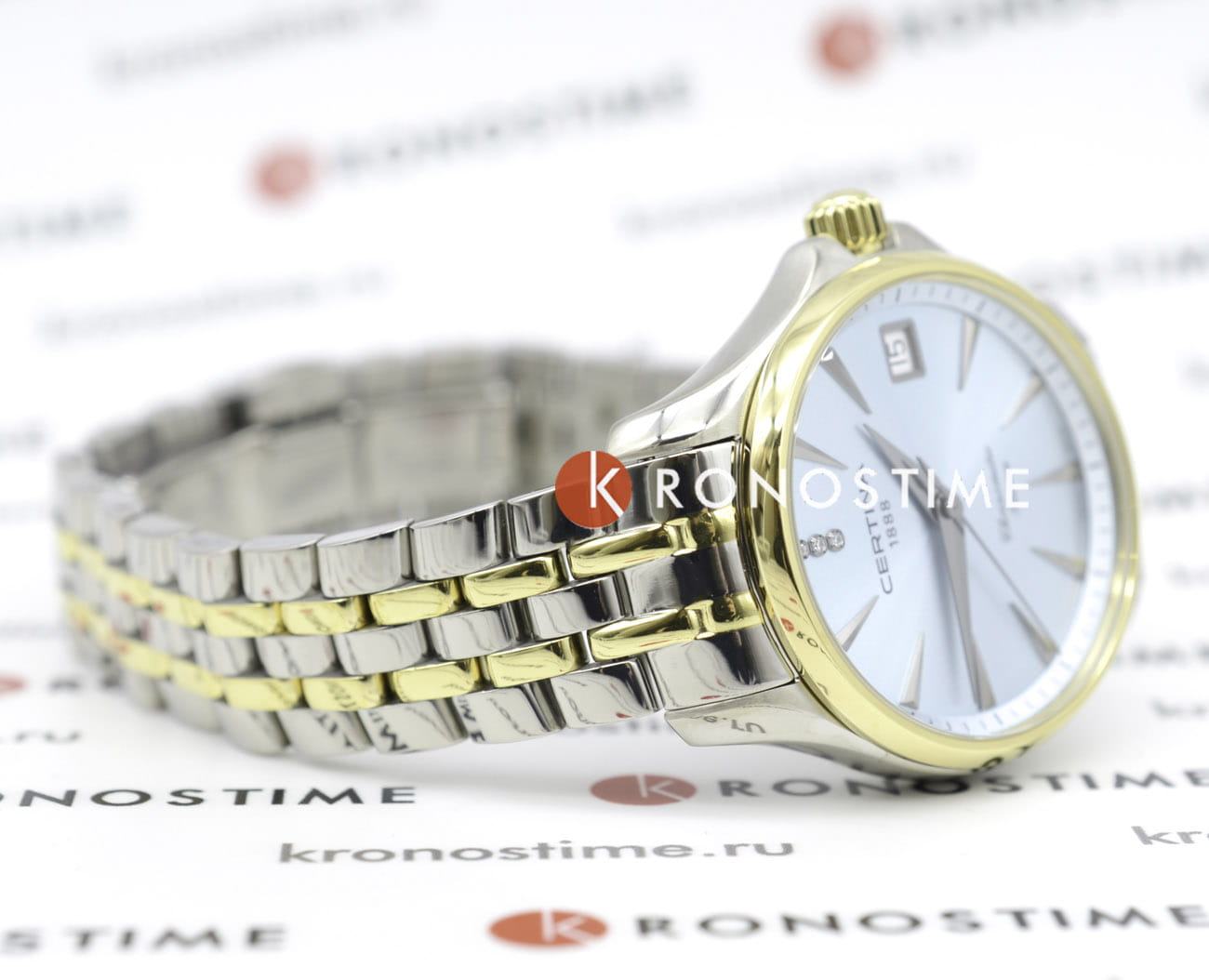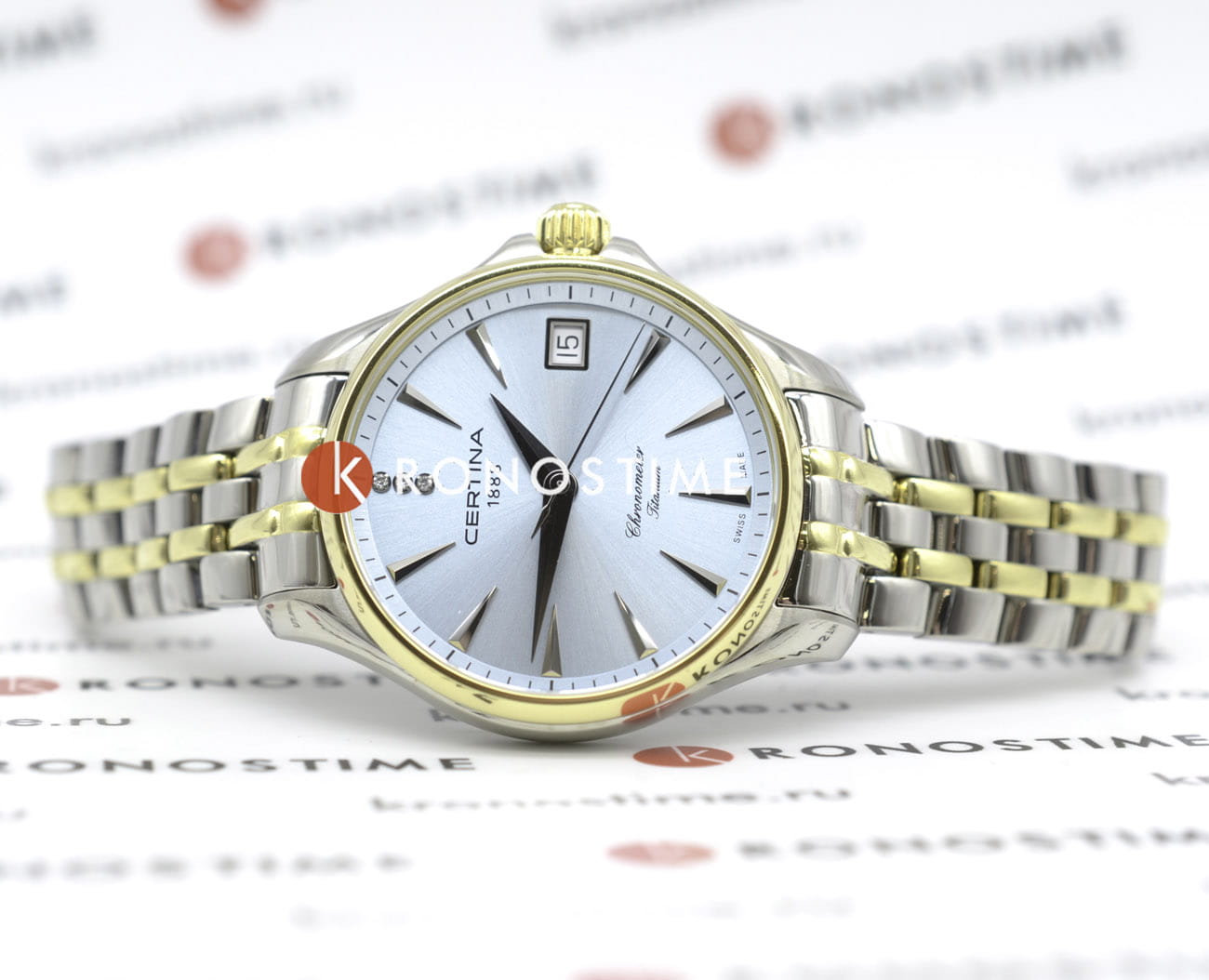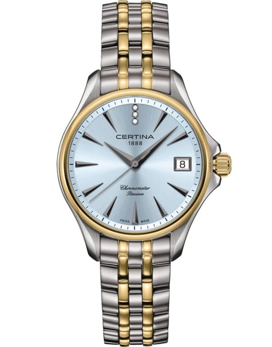 Аксессуар обладает изящным силуэтом, отражающим классический стиль и элегантность. Циферблат украшен 3 роскошными бриллиантами оттенка Top Wesselton. Часы комплектуются высокоточным кварцевым калибром F06.412 от швейцарской компании ETA, высокая точность механизма подтверждается сертификатом хронометра COSCСертификат COSCОфициальный сертификат, подтверждающий то, что часы ходят с особо высокой точностью. Для получения документа часы подвергаются тестовым испытаниям, разработанным швейцарским институтом тестирования хронометров COSC. Допустимая норма для механических часов -4/+6 секунд в день, для кварцевых моделей +/- 0,07 секунд в день.. Концепция DS ConceptDS ConceptDouble Security Concept, обозначает двойную надёжность и безупречную точность часов Certina. Двойная система защиты подразумевает обеспечение максимальной устойчивости к ударам и высоких показателей водонепроницаемости. гарантирует повышенную ударопрочность часов и сохранение водонепроницаемости до 20 бар. Одностороннее антибликовое покрытие сапфирового стекла. Корпус часов изготовлен из титана. Титановый браслет с PVD-покрытиемPVDУльтратонкое покрытие наносится в технике вакуумного напыления, сочетает в себе нитрид титана особой прочности со слоем золота или оксида хрома. Несёт в себе декоративную или защитную функцию. на застёжке-бабочке с кнопкамиЗастёжка "бабочка"Такой вид застёжки дополняется предохранителями, помогающими избежать случайного раскрытия браслета. Обладают изящным исполнением. . Окошко даты, функция EOLEOLПредставляет собой систему, уведомляющую владельца часов о необходимости замены элемента питания. За 2 недели до полного разряда батарейки секундная стрелка перестаёт ходить чётко и начинает перепрыгивать на 3-4 деления.. Диаметр корпуса: 33,8 мм.