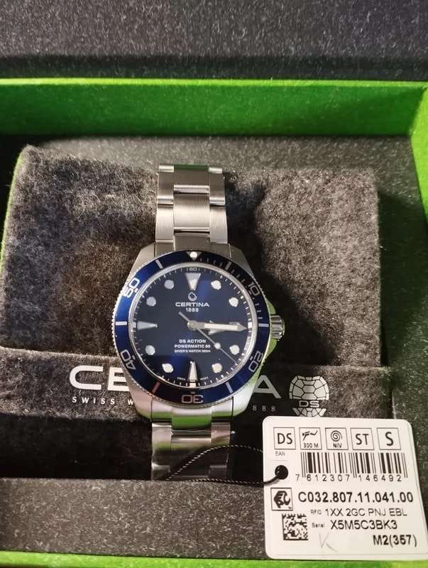 Швейцарские мужские механические часы Certina DS Action Diver Powermatic 80 C032.807.11.041.00 из коллекции DS Action отражают непревзойдённый стиль с дайверским характером. Модель имеет яркий акцент в виде синего циферблата. Крупная индикация времени позволяет считывать показания с циферблата в любой ситуации. Автоматический швейцарский калибр ETA Powermatic 80Powermatic 80Эксклюзивный калибр от швейцарской компании ETA с увеличенным запасом хода до 80 часов за счёт удлинённой заводной пружины. Характеризуется улучшенной системой спуска со сниженным трением. с резервом хода на 80 часов. Концепция DS ConceptDS ConceptDouble Security Concept, обозначает двойную надёжность и безупречную точность часов Certina. Двойная система защиты подразумевает обеспечение максимальной устойчивости к ударам и высоких показателей водонепроницаемости.. Сапфировое стекло. Алюминиевый вращающийся безельБезельВнешний ободок, закрепляющий стекло. В спортивных часах так называется поворотное кольцо с делениями на циферблате, выполняет роль таймера – замеряет отрезки времени на шкале. Неподвижный безель – элемент декора. Однонаправленно вращающийся безель на дайверских часах позволяет фиксировать моменты погружения и выныривания на поверхность.. Водонепроницаемость 300 метров. Люминесцентная подсветкаЛюминесцентное покрытиеПозволяет считывать показания времени в темноте. Производители наносят на стрелки, часовые индексы, безель или поверхность циферблата светонакопительный состав, дающий холодное свечение.. Стальной браслет с застёжкой, имеющей удлинение для дайверовУдлинение для дайверовЗастёжка с удлинением для дайверов представляет собой безопасное крепление, которое позволяет надевать часы поверх гидрокостюма. Гибкая застёжка удлиняется на 1-2 миллиметра.. Апертура даты. Диаметр корпуса: 38 мм. Производство и сборка: Швейцария.