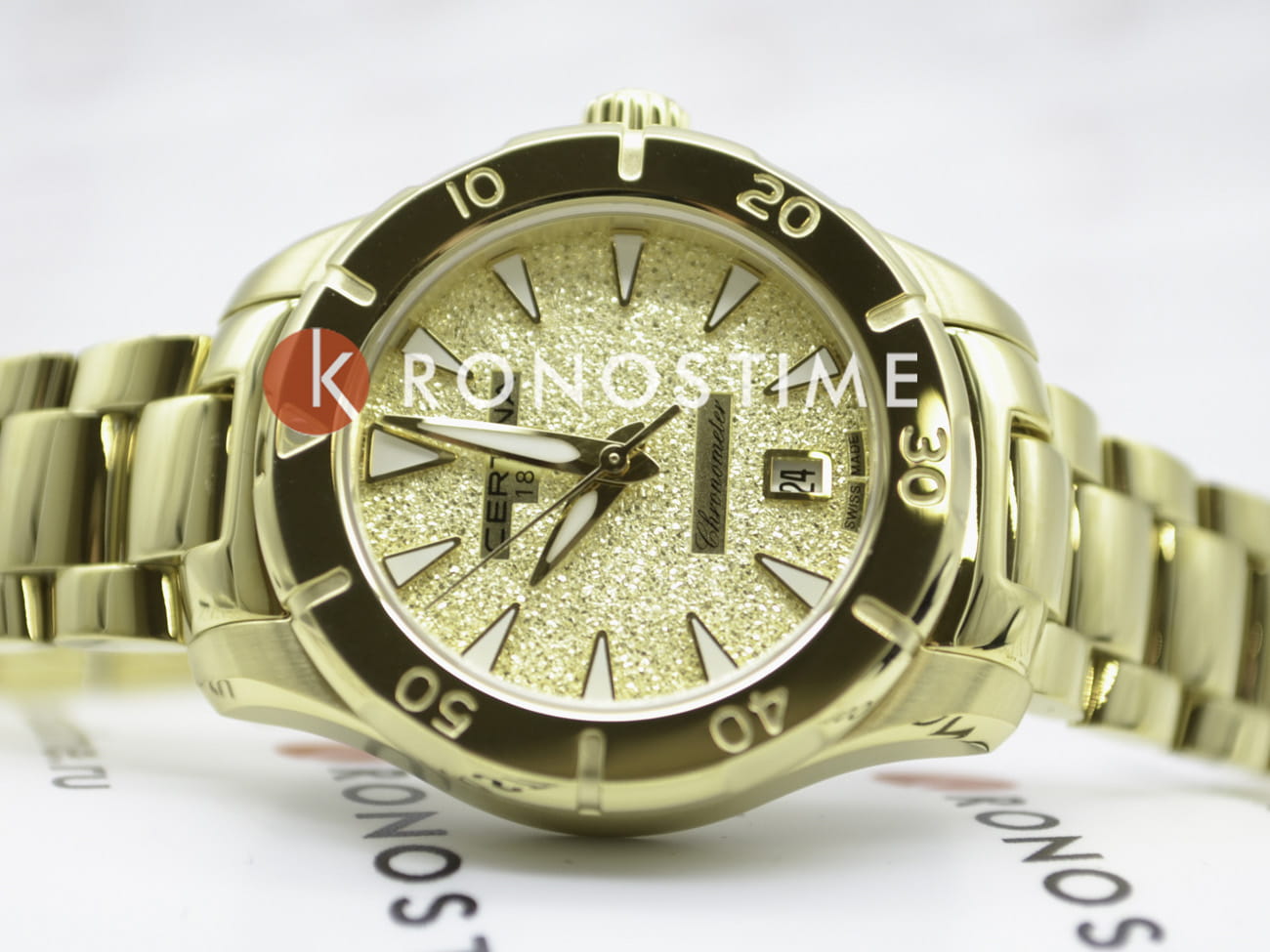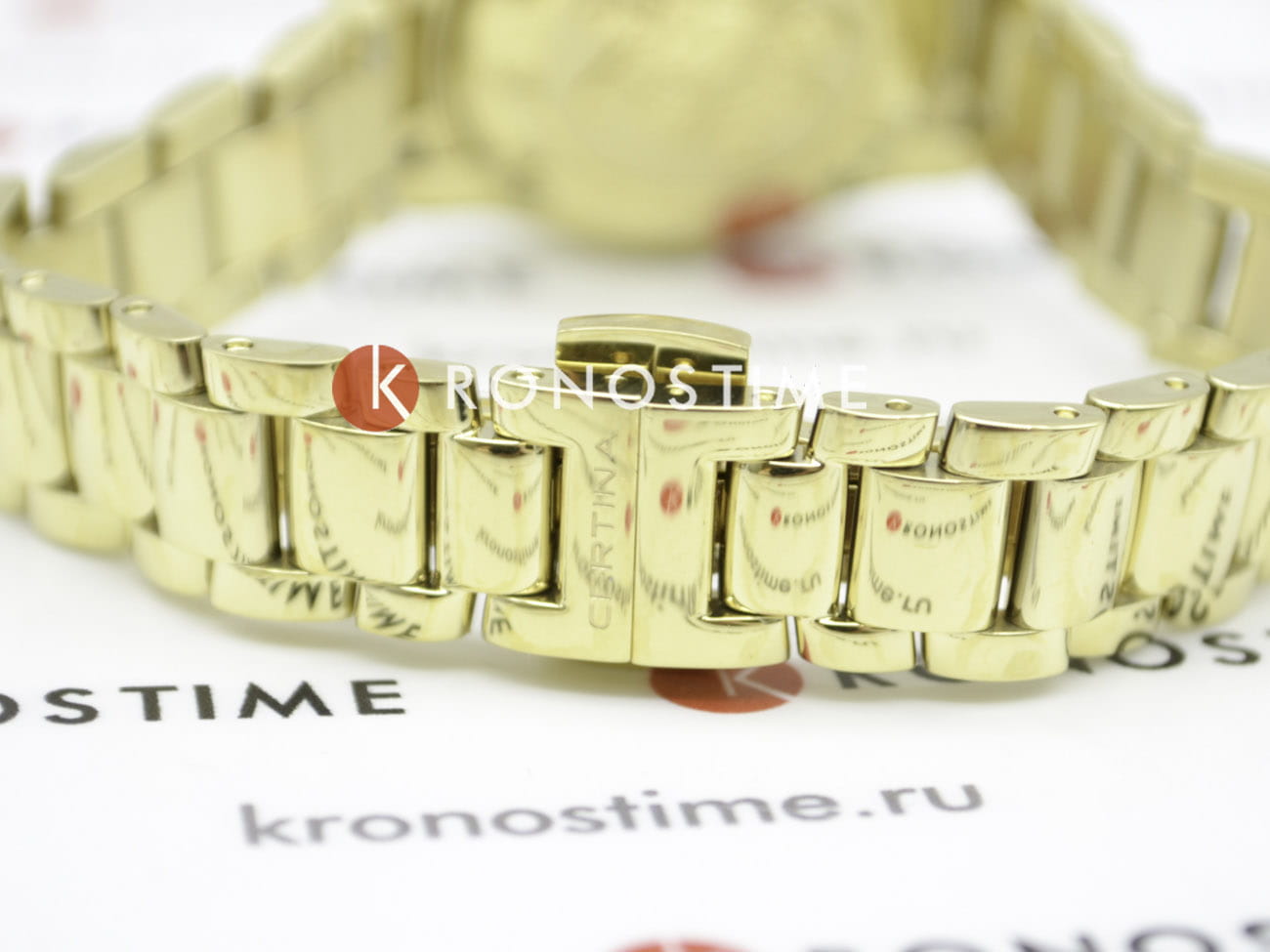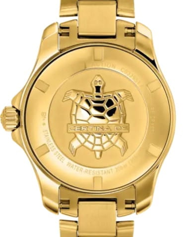 Certina DS Action Lady C032.951.33.361.00 из коллекции DS Action символизируют любовь бренда к водной стихии и высокоточным механизмам. Компактный аксессуар создан по всем правилам дайверской тематики: вращающийся безельБезельВнешний ободок, закрепляющий стекло. В спортивных часах так называется поворотное кольцо с делениями на циферблате, выполняет роль таймера – замеряет отрезки времени на шкале. Неподвижный безель – элемент декора. Однонаправленно вращающийся безель на дайверских часах позволяет фиксировать моменты погружения и выныривания на поверхность., крупная индикация времени, завинчивающаяся заводная головка и задняя крышка. Стильно смотрится золотистый циферблат в сочетании с холодным блеском нержавеющей стали 316L с PVD-покрытиемPVDУльтратонкое покрытие наносится в технике вакуумного напыления, сочетает в себе нитрид титана особой прочности со слоем золота или оксида хрома. Несёт в себе декоративную или защитную функцию.. Часы оснащены швейцарским кварцевым калибром ETA F04.412 Precidrive™Precidrive™Инновационный кварцевый механизм Certina. Часы, оснащённые этим швейцарским калибром, приравниваются к точности к сертифицированным хронометрам, точность хода составляет +/-10 секунд в год., точность хода которого отмечена официальным сертификатом COSCСертификат COSCОфициальный сертификат, подтверждающий то, что часы ходят с особо высокой точностью. Для получения документа часы подвергаются тестовым испытаниям, разработанным швейцарским институтом тестирования хронометров COSC. Допустимая норма для механических часов -4/+6 секунд в день, для кварцевых моделей +/- 0,07 секунд в день.. Модель отличается максимальной водонепроницаемостью 200 метров, сапфировое стекло дополнено антибликовым покрытием. Функции: отображение даты, индикатор EOLEOLПредставляет собой систему, уведомляющую владельца часов о необходимости замены элемента питания. За 2 недели до полного разряда батарейки секундная стрелка перестаёт ходить чётко и начинает перепрыгивать на 3-4 деления.. Диаметр корпуса: 29 мм. Производство и сборка: Швейцария.