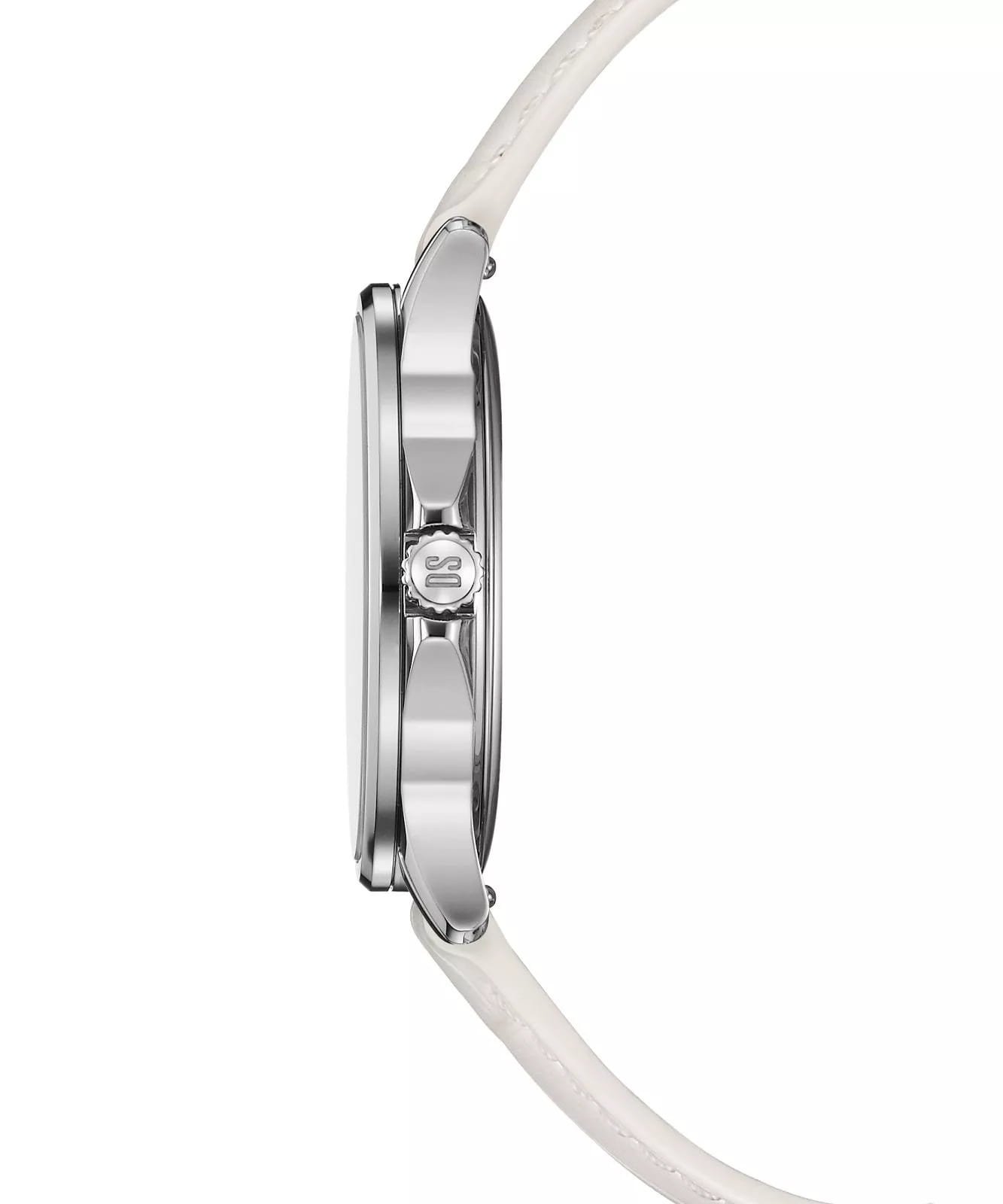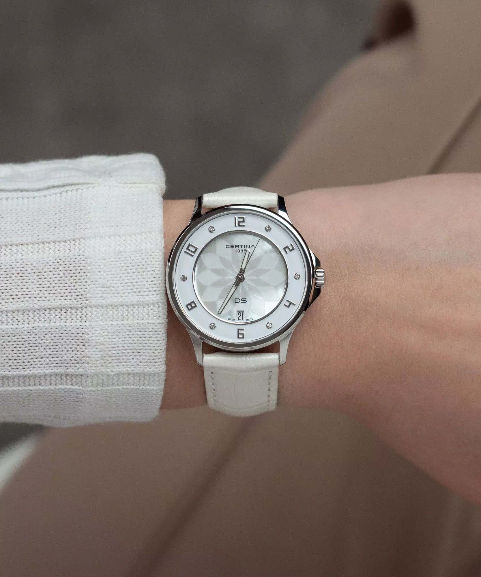 Женские швейцарские часы Certina DS-6 Lady C039.251.16.116.00 — это изысканный аксессуар, сочетающий в себе надёжность, точность и элегантный дизайн. Модель выполнена из нержавеющей стали 316L с минеральным стекломМинеральное стеклоМинеральное стекло представляет собой искусственно выращенный минерал кварца. Такое стекло отличается особой устойчивостью к повреждениям и царапинам. Уступает по некоторым качествам сапфировому стеклу. и инкрустированной бриллиантами, что придаёт ей роскошный внешний вид. Циферблат белого перламутра дополнен апертурой даты на отметке 6 часов, а его поверхность защищена сапфировым стекломСапфировое стеклоПрочный и надёжный материал из кристалла сапфира синтетического происхождения, характеризующийся особой твёрдостью и устойчивостью к царапинам и повреждениям. с антибликовым покрытиемАнтибликовое покрытиеСлой оксида металла в 0,13-0,3 микрон, благодаря которому стекло часов не бликует и не отражает свет. Антибликовое покрытие уменьшает отражение света в 10 раз, обеспечивая отличную читаемость показателей циферблата., устойчивым к царапинам и обеспечивающим чёткую видимость при любом освещении. Ремешок из телячьей кожи с тиснением крокодила жемчужно-белого цвета оснащён пряжкой из нержавеющей стали, обеспечивая комфорт и надёжную фиксацию на запястье. Часы водонепроницаемы до 100 метров (, что позволяет использовать их при плавании и других водных активностях без глубокого погружения. Гарантия 24 месяца подтверждает качество и долговечность изделия. Эти часы станут универсальным аксессуаром для тех, кто ценит сочетание стиля, функциональности и швейцарского мастерства — идеальный выбор для повседневной носки и торжественных случаев.