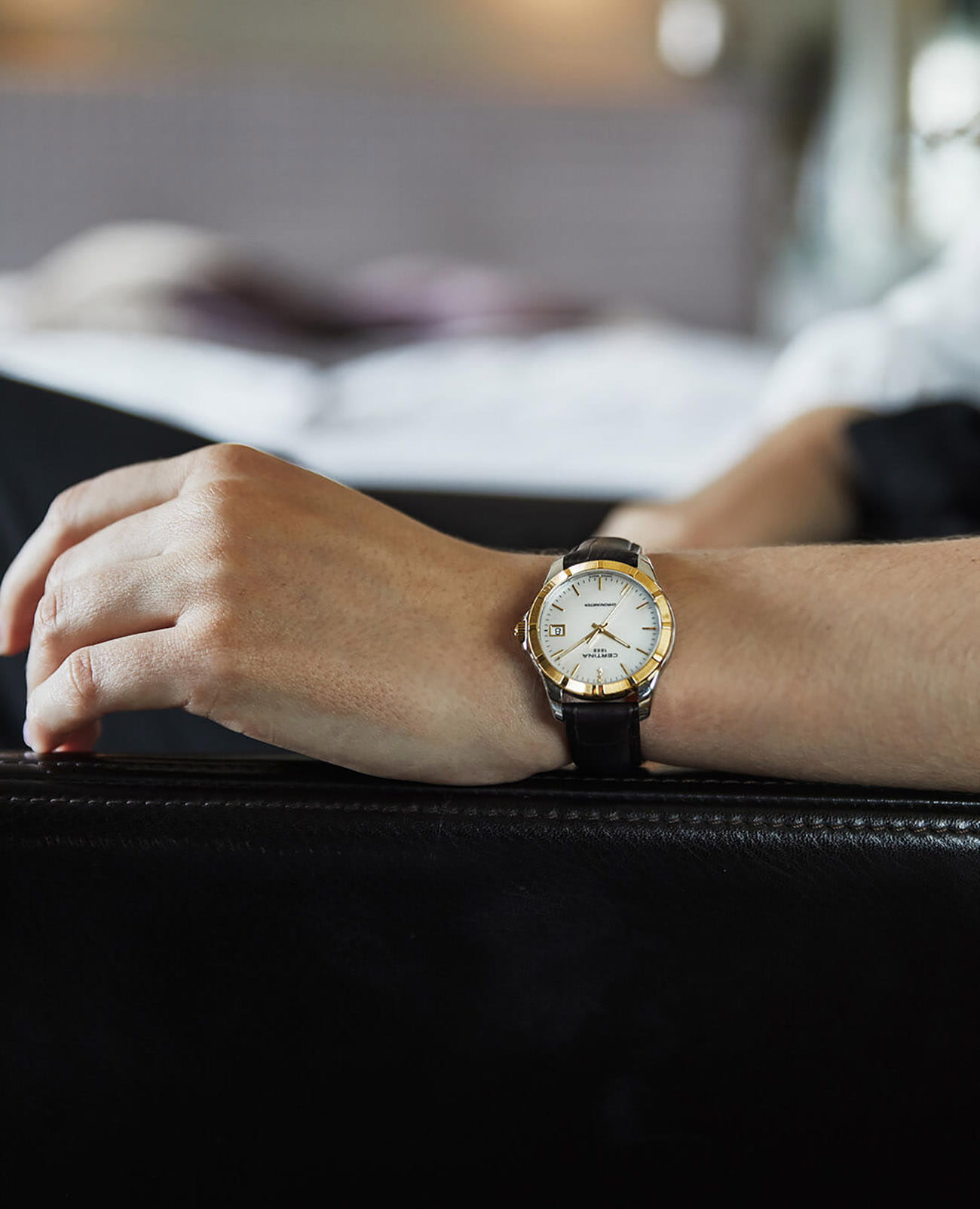 . Швейцарский кварцевый механизм ETA E64.111 Precidrive™Precidrive™Инновационный кварцевый механизм Certina. Часы, оснащённые этим швейцарским калибром, приравниваются к точности к сертифицированным хронометрам, точность хода составляет +/-10 секунд в год. измеряет время с максимальной точностью хода. Благодаря этому часы имеют статус хронометра и наделены сертификатом COSCСертификат COSCОфициальный сертификат, подтверждающий то, что часы ходят с особо высокой точностью. Для получения документа часы подвергаются тестовым испытаниям, разработанным швейцарским институтом тестирования хронометров COSC. Допустимая норма для механических часов -4/+6 секунд в день, для кварцевых моделей +/- 0,07 секунд в день.. Сапфировое стекло имеет одностороннее антибликовое покрытиеАнтибликовое покрытиеСлой оксида металла в 0,13-0,3 микрон, благодаря которому стекло часов не бликует и не отражает свет. Антибликовое покрытие уменьшает отражение света в 10 раз, обеспечивая отличную читаемость показателей циферблата.. Функции: календарь, индикатор EOLEOLПредставляет собой систему, уведомляющую владельца часов о необходимости замены элемента питания. За 2 недели до полного разряда батарейки секундная стрелка перестаёт ходить чётко и начинает перепрыгивать на 3-4 деления..