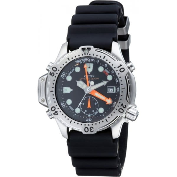 Глубиномер до 55 м, сигнал максимального времени погружения, максимальной глубины и декомпрессии, секундомер. Корпус: сталь; Браслет: каучуковый (специальная конструкция для дайверов); Стекло: Минеральное; Водонепроницаемость:200 м. (WR 200).