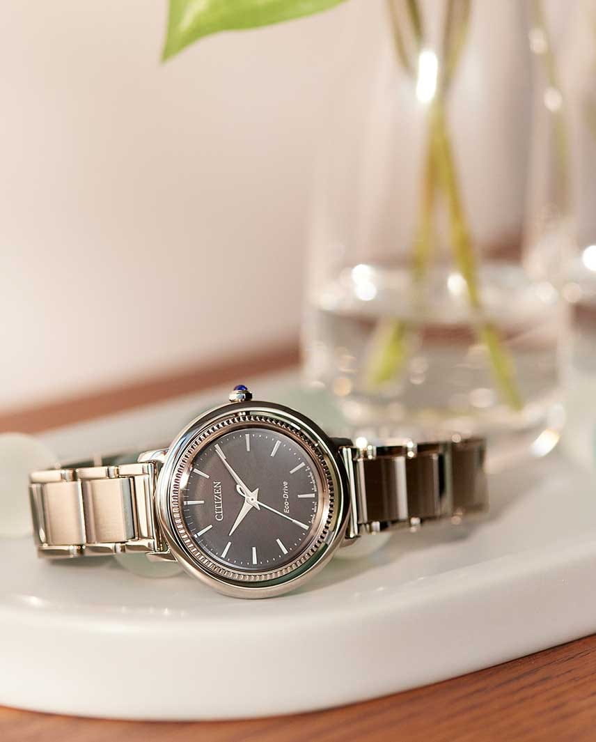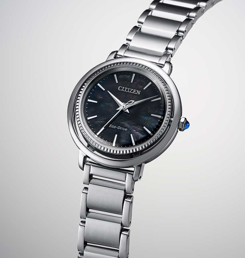 Элегантные часы Citizen EM1100-84H произведены в Японии и оснащены современным кварцевым механизмом Citizen E031 с инновационной системой Eco-Drive, которая использует энергию солнечного света и не требует замены батарейки, обеспечивая до 180 дней работы в автономном режиме. Корпус и браслет выполнены из высококачественной нержавеющей стали, что гарантирует долговечность и износостойкость. Перламутровый черный циферблат с изящными штриховыми метками защищён выпуклым сапфировым стекломСапфировое стеклоПрочный и надёжный материал из кристалла сапфира синтетического происхождения, характеризующийся особой твёрдостью и устойчивостью к царапинам и повреждениям., устойчивым к царапинам. БезельБезельВнешний ободок, закрепляющий стекло. В спортивных часах так называется поворотное кольцо с делениями на циферблате, выполняет роль таймера – замеряет отрезки времени на шкале. Неподвижный безель – элемент декора. Однонаправленно вращающийся безель на дайверских часах позволяет фиксировать моменты погружения и выныривания на поверхность. часов декорирован алмазной гранью, а заводная головка украшена камнем в форме кабошона, что придаёт модели особый шарм. Задняя крышка закреплена на четырёх винтах, что повышает надёжность конструкции. Часы имеют водозащиту до 50 метров, а также функцию индикации заряда и предотвращения перезарядки. Размер корпуса составляет 31,2 мм в диаметре и 8 мм в толщину, вес — 71 грамм. Застежка «бабочка»Застёжка "бабочка"Такой вид застёжки дополняется предохранителями, помогающими избежать случайного раскрытия браслета. Обладают изящным исполнением. у браслета обеспечивает комфортное и надёжное ношение. Эта модель идеально подчеркнёт изысканный стиль и индивидуальность своей обладательницы.