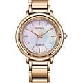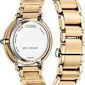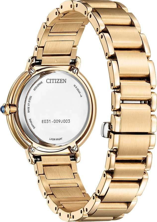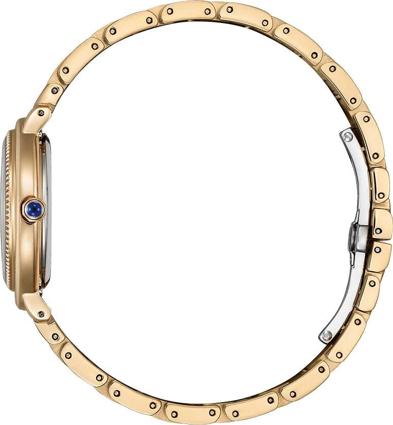Элегантные часы Citizen EM1103-86Y произведены в Японии и оснащены современным кварцевым механизмом Citizen E031 с инновационной системой Eco-Drive, которая использует энергию солнечного света и не требует замены батарейки, обеспечивая до 180 дней работы в автономном режиме. Корпус и браслет выполнены из высококачественной нержавеющей стали с золотым IP-покрытиемIP-покрытиеМетод ионного напыления. Демонстрирует повышенную устойчивость к истиранию, окислению и химическим веществам. Под воздействием высокого давления и температуры около 1500°C молекулы металла надёжно соединяются с частицами корпуса часов., что гарантирует долговечность и износостойкость. Перламутровый голубой и розовый циферблат с изящными штриховыми метками защищён выпуклым сапфировым стекломСапфировое стеклоПрочный и надёжный материал из кристалла сапфира синтетического происхождения, характеризующийся особой твёрдостью и устойчивостью к царапинам и повреждениям., устойчивым к царапинам. БезельБезельВнешний ободок, закрепляющий стекло. В спортивных часах так называется поворотное кольцо с делениями на циферблате, выполняет роль таймера – замеряет отрезки времени на шкале. Неподвижный безель – элемент декора. Однонаправленно вращающийся безель на дайверских часах позволяет фиксировать моменты погружения и выныривания на поверхность. часов декорирован алмазной гранью, а заводная головка украшена камнем в форме кабошона, что придаёт модели особый шарм. Задняя крышка закреплена на четырёх винтах, что повышает надёжность конструкции. Часы имеют водозащиту до 50 метров, а также функцию индикации заряда и предотвращения перезарядки. Размер корпуса составляет 31,2 мм в диаметре и 8 мм в толщину, вес — 71 грамм. Застежка «бабочка»Застёжка "бабочка"Такой вид застёжки дополняется предохранителями, помогающими избежать случайного раскрытия браслета. Обладают изящным исполнением. у браслета обеспечивает комфортное и надёжное ношение. Эта модель идеально подчеркнёт изысканный стиль и индивидуальность своей обладательницы.