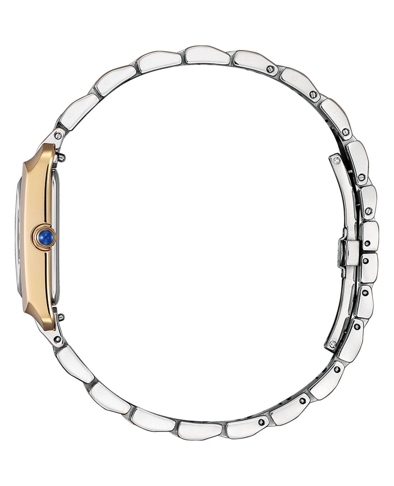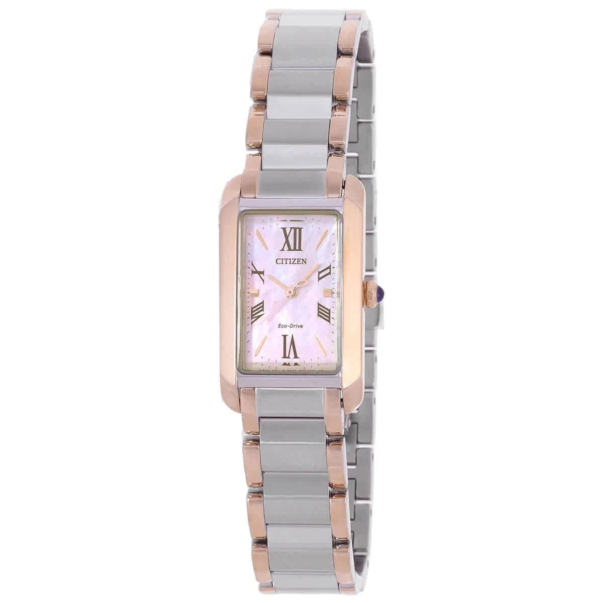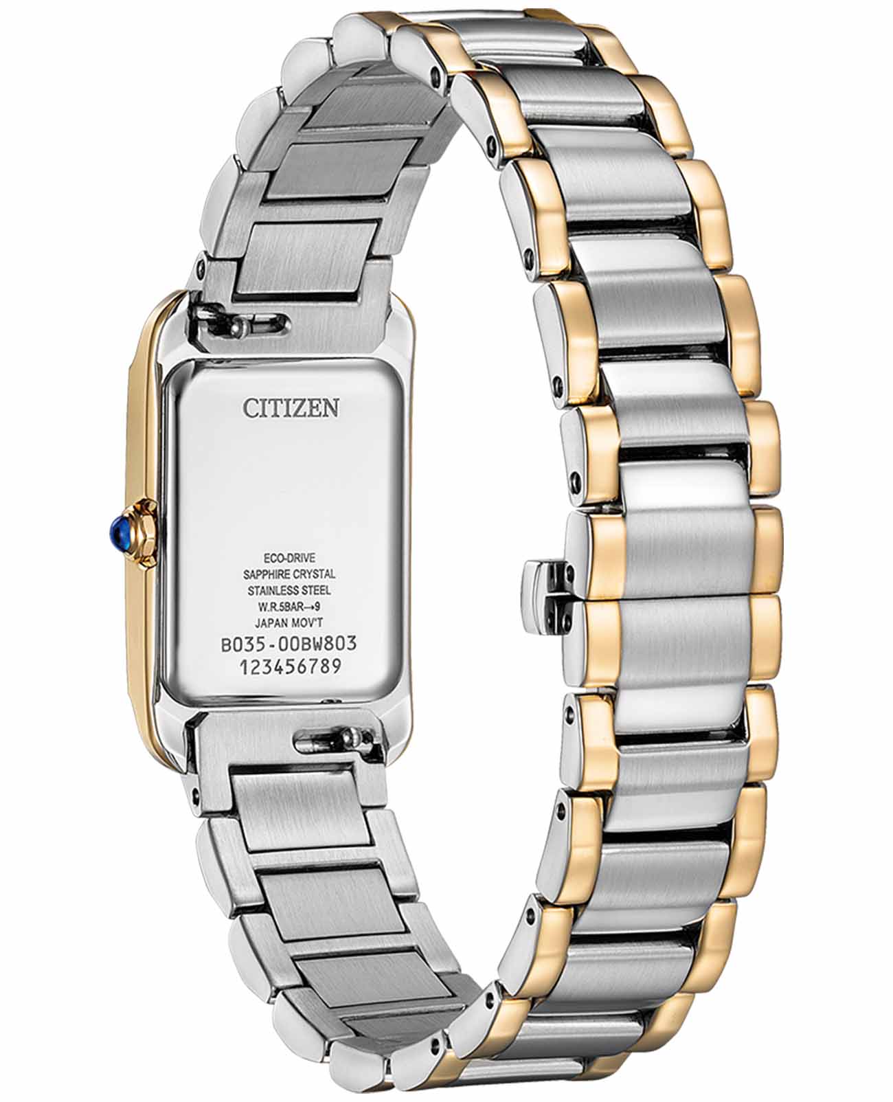 Изящные женские часы Citizen EW5624-54Y сочетают в себе японское качество и современный дизайн. Корпус прямоугольной формы выполнен из прочной нержавеющей стали, а элегантный браслет оснащён удобной застежкой «бабочка»Застёжка "бабочка"Такой вид застёжки дополняется предохранителями, помогающими избежать случайного раскрытия браслета. Обладают изящным исполнением. . Перламутровый циферблат украшен римскими цифрами и изысканными синими стрелками. На браслет и корпус частично нанесено золотистое IP-покрытиеIP-покрытиеМетод ионного напыления. Демонстрирует повышенную устойчивость к истиранию, окислению и химическим веществам. Под воздействием высокого давления и температуры около 1500°C молекулы металла надёжно соединяются с частицами корпуса часов.. Модель оснащена надёжным кварцевым механизмом японского производства, защищена сапфировым стекломСапфировое стеклоПрочный и надёжный материал из кристалла сапфира синтетического происхождения, характеризующийся особой твёрдостью и устойчивостью к царапинам и повреждениям. и обладает водозащитой WR 50, что позволяет использовать часы во время плавания. Размеры корпуса — 19 мм в ширину, 32,5 мм в высоту и 7 мм в толщину. На изделие предоставляется гарантия сроком 1 год.