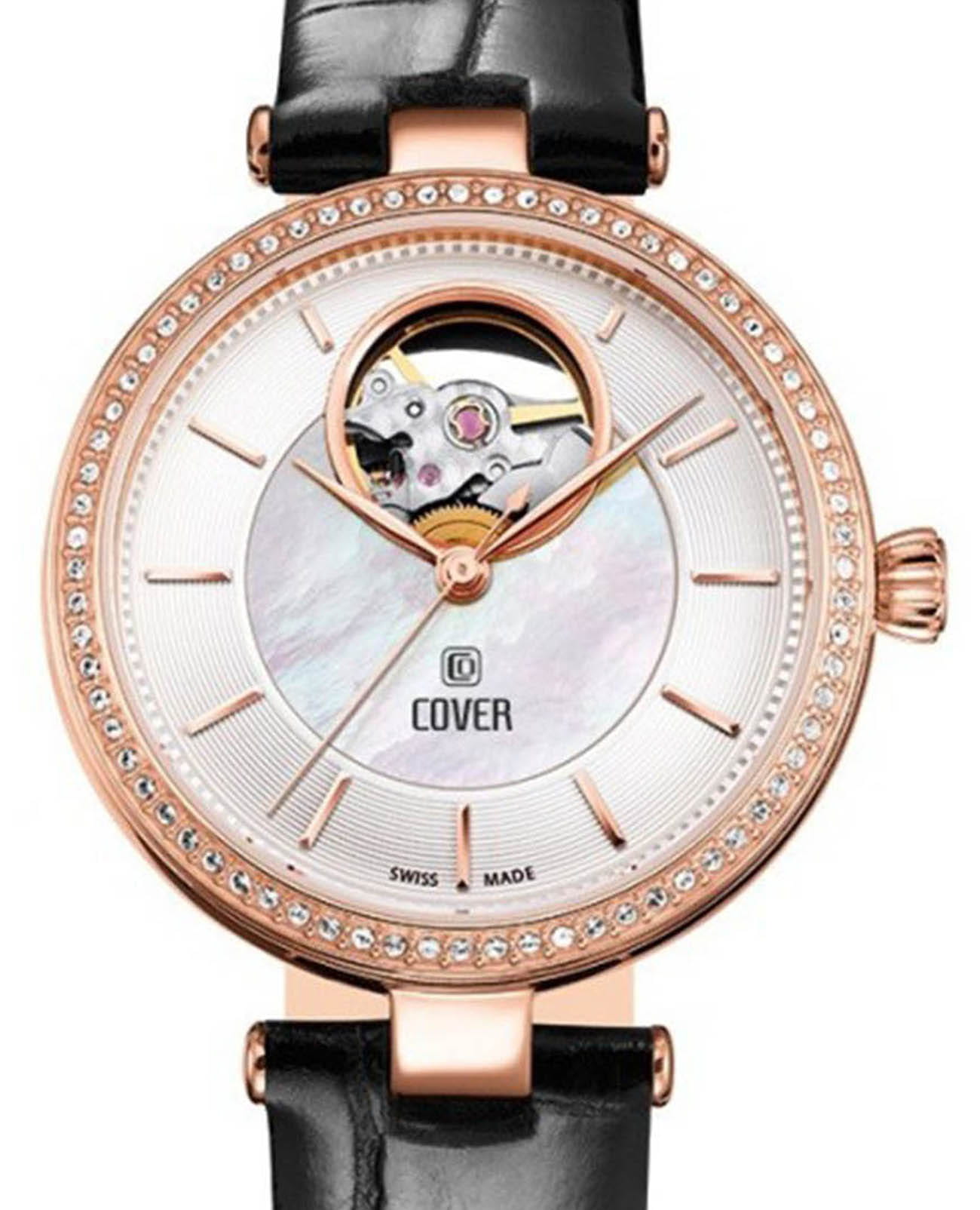 Часы COVER COA9.06 из коллекции Concerta Open Heart – элегантная модель швейцарского производства. Корпус выполнен из нержавеющей стали золотого цвета. Центральная область циферблата – белый перламутр, периферийная – круговое гильоше. Тонкий безельБезельВнешний ободок, закрепляющий стекло. В спортивных часах так называется поворотное кольцо с делениями на циферблате, выполняет роль таймера – замеряет отрезки времени на шкале. Неподвижный безель – элемент декора. Однонаправленно вращающийся безель на дайверских часах позволяет фиксировать моменты погружения и выныривания на поверхность. с покрытием PVDPVDУльтратонкое покрытие наносится в технике вакуумного напыления, сочетает в себе нитрид титана особой прочности со слоем золота или оксида хрома. Несёт в себе декоративную или защитную функцию. инкрустирован кристаллами Swarovski подчеркивает изысканный стиль. Сапфировое стеклоСапфировое стеклоПрочный и надёжный материал из кристалла сапфира синтетического происхождения, характеризующийся особой твёрдостью и устойчивостью к царапинам и повреждениям. защищает поверхность от повреждений. Водозащита 100 метров делает часы практичными для повседневного использования. Диаметр корпуса – 35 мм. Черный кожаный ремешок с классической застежкой обеспечивает надежную фиксацию и удобство в носке.