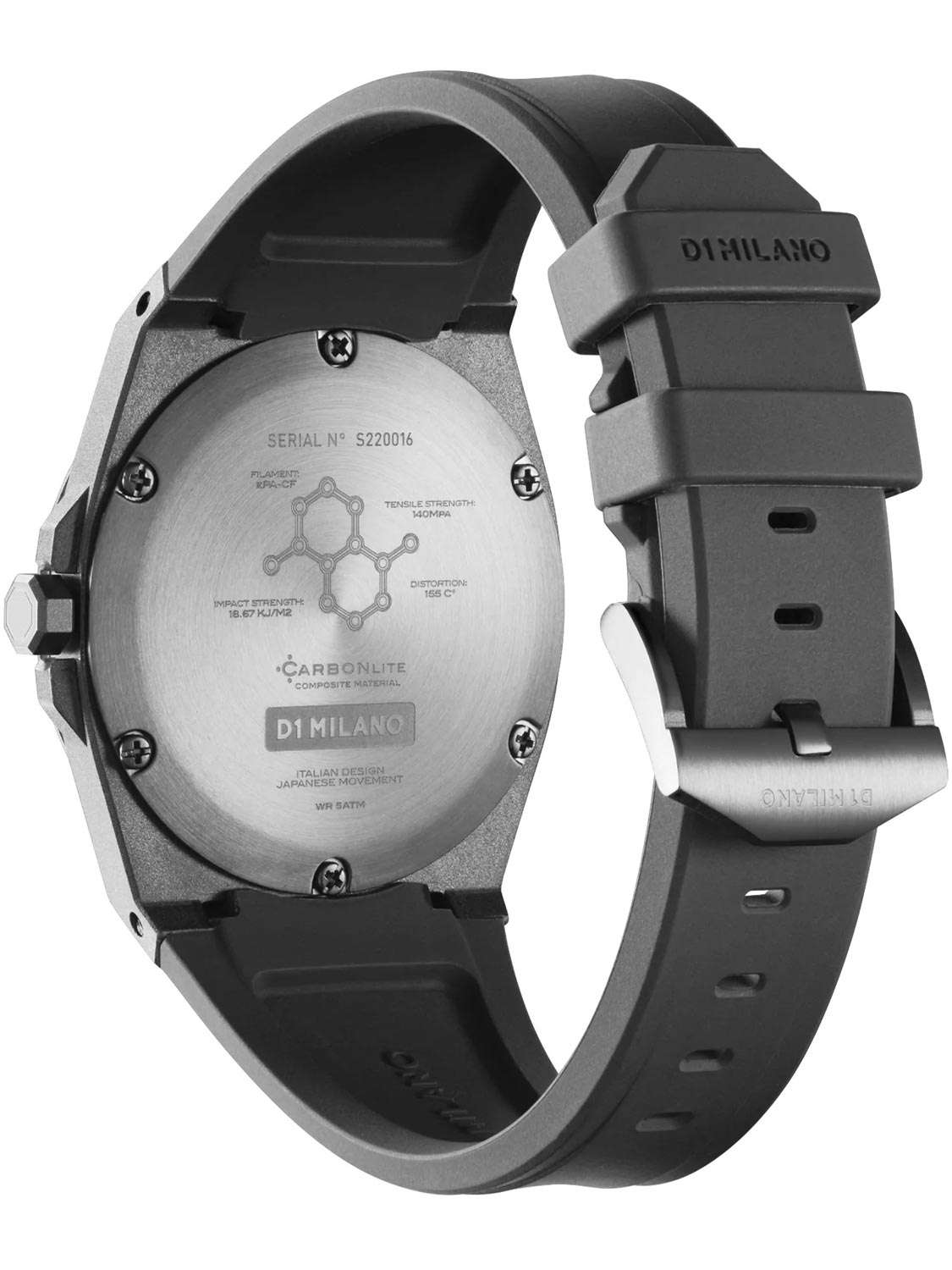 Мужские часы D1 Milano CLRJ02 из коллекции Carbonlite - воплощение инновационного дизайна и передовых материалов. Круглый корпус диаметром 40,5 мм и толщиной 9,7 мм изготовлен из композита углеродного нейлона с поликарбонатной рамкой. Циферблат выполнен в виде "сэндвича" из углеродного волокна. Часы оснащены кварцевым механизмом Miyota GL22, минеральное стекломМинеральное стеклоМинеральное стекло представляет собой искусственно выращенный минерал кварца. Такое стекло отличается особой устойчивостью к повреждениям и царапинам. Уступает по некоторым качествам сапфировому стеклу. с антибликовым покрытием и черным силиконовым ремешком. Водонепроницаемость 5 АТМ, вес всего 47 г. Особенность этой коллекции - использование композитных материалов из углеродного нейлона и волокна, специально разработанных D1 Milano. Нить изготовлена из EPA-CF, прочность на растяжение 140 МПа, деформация 155 градусов, ударная вязкость 18,67 кДж/м2.