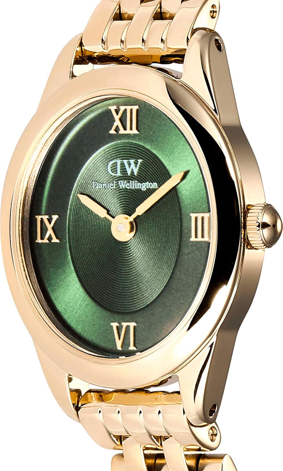 Daniel Wellington Ophelia — женственные часы с овальным корпусом 22 мм из нержавеющей стали с изящным PVDPVDУльтратонкое покрытие наносится в технике вакуумного напыления, сочетает в себе нитрид титана особой прочности со слоем золота или оксида хрома. Несёт в себе декоративную или защитную функцию.-покрытием в цвете золота. Глубокий циферблат с радиальным переливом украшен римскими индексами, что придаёт образу классическую элегантность.
