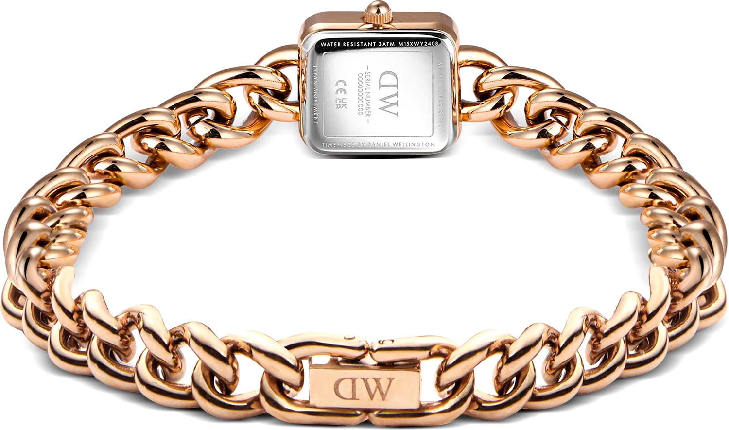Daniel Wellington Jolie Chain DW00100835 — изящные женские часы в фирменном стиле бренда с акцентом на минимализм и украшение в виде массивного браслета-цепочки. Прямоугольный корпус аккуратного размера подчёркивает современный силуэт, а браслет с широкими звеньями создаёт эффект ювелирного аксессуара.Минеральное стеклоМинеральное стеклоМинеральное стекло представляет собой искусственно выращенный минерал кварца. Такое стекло отличается особой устойчивостью к повреждениям и царапинам. Уступает по некоторым качествам сапфировому стеклу. устойчивое к мелким механическим повреждениям. Циферблат оформлен лаконично: тонкие метки и стрелки обеспечивают лёгкость восприятия времени, оставляя пространство для чистой эстетики. Корпус и браслет покрыты PVD-покрытиемPVDУльтратонкое покрытие наносится в технике вакуумного напыления, сочетает в себе нитрид титана особой прочности со слоем золота или оксида хрома. Несёт в себе декоративную или защитную функцию., что гарантирует стойкость к царапинам и сохранение блеска. Модель работает на точном кварцевом механизме, не требующем ежедневного завода, а надёжная застёжка обеспечивает комфортное ношение. Daniel Wellington Jolie Chain — это часы и стильное украшение одновременно, идеально подходящее для акцента в повседневном и вечернем образе.
