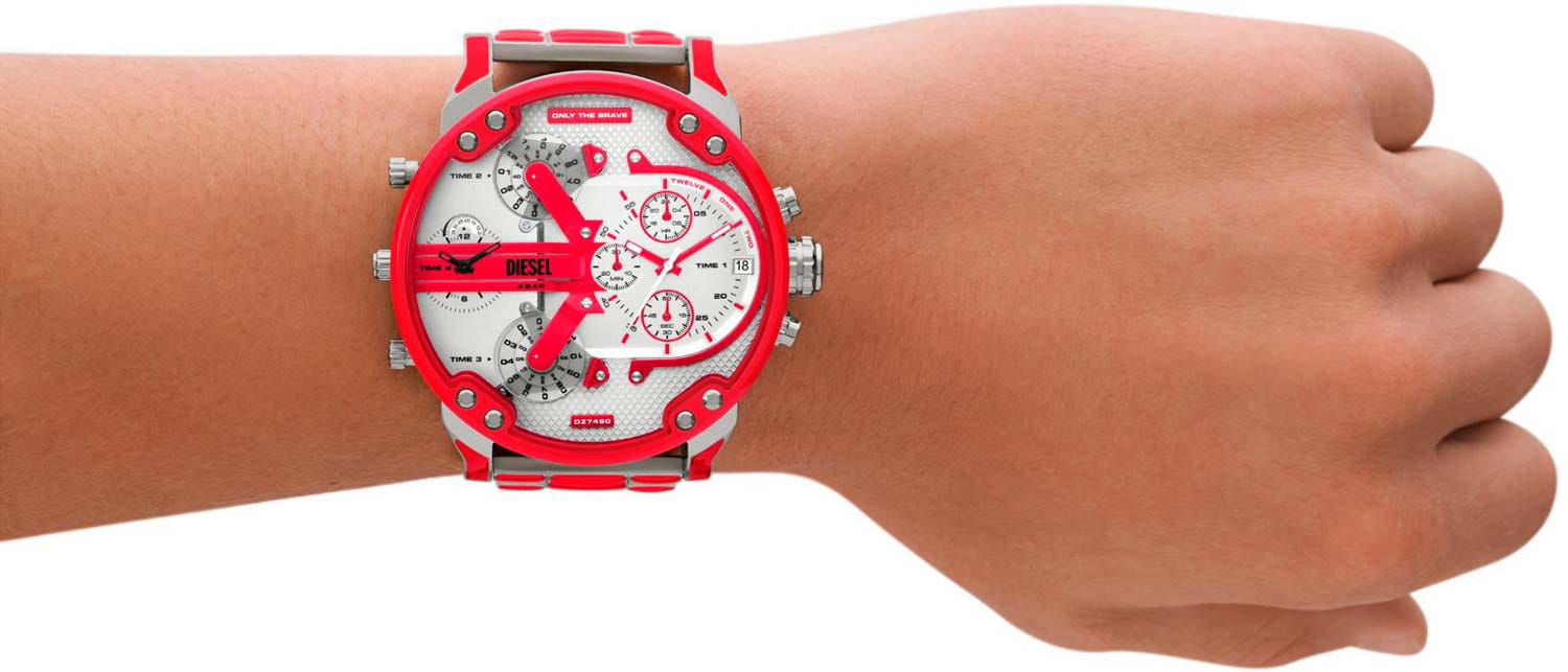 Мужские американские часы-хронографХронографФункция позволяет измерять отрезки времени с особой точностью: часы, минуты, секунды. Верным признаком хронографа является наличие на циферблате 3 дополнительных окошек-счётчиков. с секундомеромСекундомерСекундоме́р — прибор, способный измерять интервалы времени с точностью до долей секунды. Diesel Mr Daddy 2.0 DZ7480, кварцевый механизм с высокой точностью. Класс водозащиты: 30 метров, позволит защитить корпус от случайных брызг или капель дождя. Корпус часов изготовлен из стали с IP-покрытиемIP-покрытиеМетод ионного напыления. Демонстрирует повышенную устойчивость к истиранию, окислению и химическим веществам. Под воздействием высокого давления и температуры около 1500°C молекулы металла надёжно соединяются с частицами корпуса часов.. Стальной браслет на раскладной застёжкеРаскладная застёжкаТакой тип застёжки используется только на браслетах из металла. Она никогда не раскрывается полностью, происходит разделение на 2 и более частей. Раскладывающая застёжка снизит вероятность потери часов к минимуму. с IP-покрытиемIP-покрытиеМетод ионного напыления. Демонстрирует повышенную устойчивость к истиранию, окислению и химическим веществам. Под воздействием высокого давления и температуры около 1500°C молекулы металла надёжно соединяются с частицами корпуса часов.. БезельБезельВнешний ободок, закрепляющий стекло. В спортивных часах так называется поворотное кольцо с делениями на циферблате, выполняет роль таймера – замеряет отрезки времени на шкале. Неподвижный безель – элемент декора. Однонаправленно вращающийся безель на дайверских часах позволяет фиксировать моменты погружения и выныривания на поверхность. с IP-покрытиемIP-покрытиеМетод ионного напыления. Демонстрирует повышенную устойчивость к истиранию, окислению и химическим веществам. Под воздействием высокого давления и температуры около 1500°C молекулы металла надёжно соединяются с частицами корпуса часов.. 12-ти и 24-х часовой формат времени. Счетчики на 60 секунд и 30 минут. Окошко даты. Четыре часовых пояса. Четыре механизма, на двух из которых указатели часов и минут в виде вращающихся дисков, на третьем - указатель секунд. Завинчивающаяся задняя крышка.