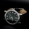 черным гильоше. Стрелки и метки с люминесцентной подсветкойЛюминесцентное покрытиеПозволяет считывать показания времени в темноте. Производители наносят на стрелки, часовые индексы, безель или поверхность циферблата светонакопительный состав, дающий холодное свечение.. Окошко даты находится в положении 6 часов. Прозрачная задняя крышка. Класс водозащиты: 50 метров, позволит защитить корпус от случайных брызг или капель дождя. Кожаный ремешок на стандартной застёжке.