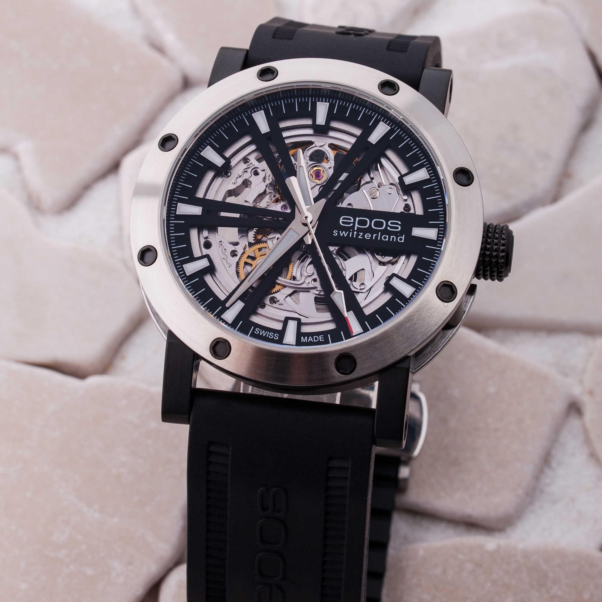 Мужские швейцарские механические наручные часы с автоподзаводом Epos Sportive 3422.135.60.15.55, механический механизм (автоматический калибр) с высокой точностью. Сапфировое стеклоСапфировое стеклоПрочный и надёжный материал из кристалла сапфира синтетического происхождения, характеризующийся особой твёрдостью и устойчивостью к царапинам и повреждениям. устойчивое к появлению царапин, обладающее высокой прозрачностью. Класс водозащиты: 50 метров, позволит защитить корпус от случайных брызг или капель дождя. Корпус часов изготовлен из стали. Силиконовый ремешок на стандартной застёжке. Стрелки и метки с люминесцентным покрытиемЛюминесцентное покрытиеПозволяет считывать показания времени в темноте. Производители наносят на стрелки, часовые индексы, безель или поверхность циферблата светонакопительный состав, дающий холодное свечение.. Прозрачная задняя крышка.