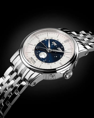Мужские швейцарские механические часы с автоподзаводом Epos Oeuvre d'art 3439.322.20.18.30. Сапфировое стеклоСапфировое стеклоПрочный и надёжный материал из кристалла сапфира синтетического происхождения, характеризующийся особой твёрдостью и устойчивостью к царапинам и повреждениям. устойчивое к появлению царапин, обладающее высокой прозрачностью. Корпус и браслет часов изготовлен из нержавеющей стали. Стрелки и метки с люминесцентной подсветкойЛюминесцентное покрытиеПозволяет считывать показания времени в темноте. Производители наносят на стрелки, часовые индексы, безель или поверхность циферблата светонакопительный состав, дающий холодное свечение.. В механизме 25 камней, частота 28800 полуколебаний в час. Запас хода 42 часа. Механизм декорирован узором Cotes de Geneve. Циферблат выполнен по технологии Sunray (солнечные лучи). В центре циферблат дополнен изображением ночного неба со светящимися звездами и большой светящейся луной. Накладные метки в виде штрихов. Дата отображается центральной стрелкой. Окошко дня недели и месяца. Автоматический указатель фазы луны. Винтажная заводная головка. Прозрачная задняя крышка. Класс водозащиты: 50 метров, позволит защитить корпус от случайных брызг или капель дождя. Стальной браслет на раскладной застёжкеРаскладная застёжкаТакой тип застёжки используется только на браслетах из металла. Она никогда не раскрывается полностью, происходит разделение на 2 и более частей. Раскладывающая застёжка снизит вероятность потери часов к минимуму..