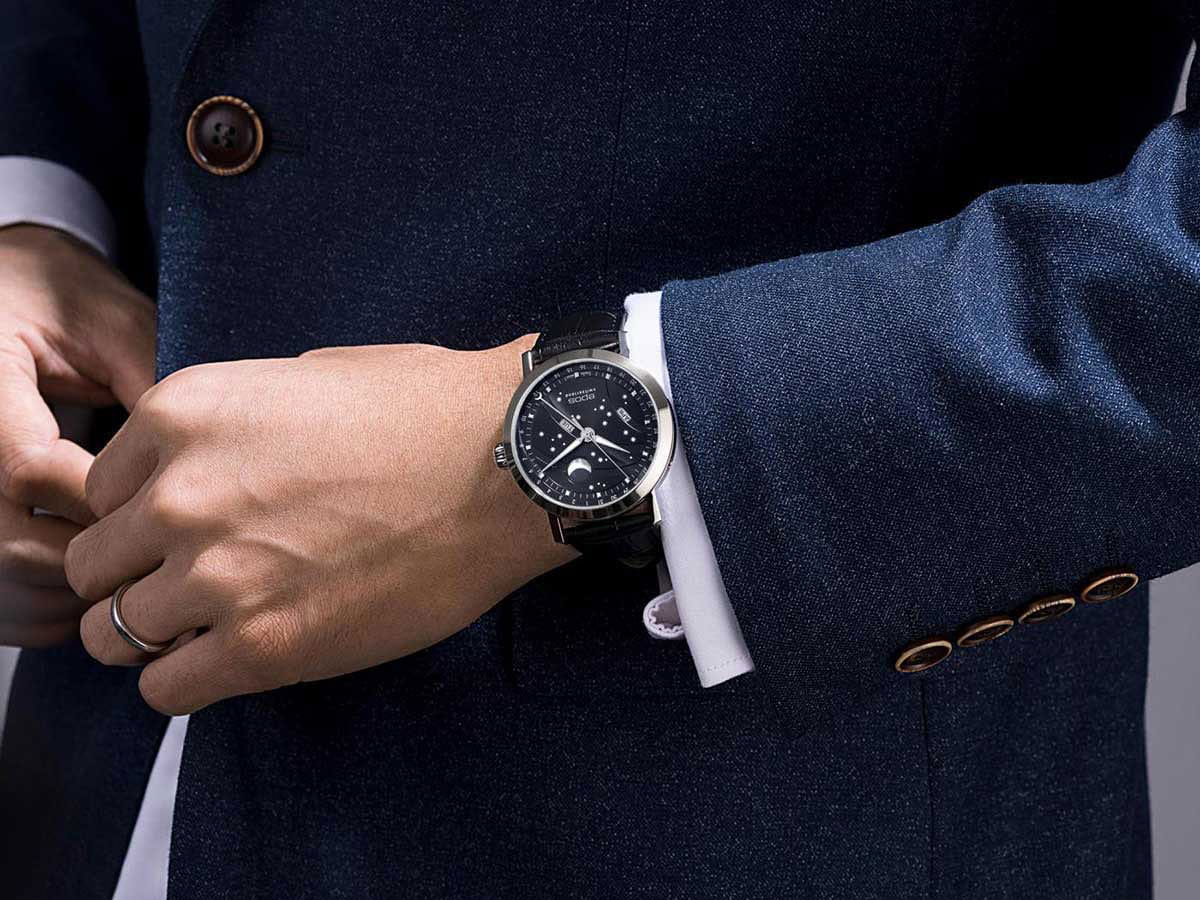 Мужские швейцарские механические часы с автоподзаводом Epos Big Moon 3440.322.20.14.25. Сапфировое стеклоСапфировое стеклоПрочный и надёжный материал из кристалла сапфира синтетического происхождения, характеризующийся особой твёрдостью и устойчивостью к царапинам и повреждениям. устойчивое к появлению царапин, обладающее высокой прозрачностью. Корпус часов изготовлен из нержавеющей стали. Стрелки и метки с люминесцентной подсветкойЛюминесцентное покрытиеПозволяет считывать показания времени в темноте. Производители наносят на стрелки, часовые индексы, безель или поверхность циферблата светонакопительный состав, дающий холодное свечение.. Циферблат с метками в виде точек. Дата отображается центральной стрелкой. Окошки для дня недели и месяца, индикатор фазы Луны. Часовой механизм декорирован жемчужной фактурной шлифовкой (Le Perlage). Прозрачная задняя крышка. Класс водозащиты: 50 метров, позволит защитить корпус от случайных брызг или капель дождя. Кожаный ремешок на стандартной застёжке.