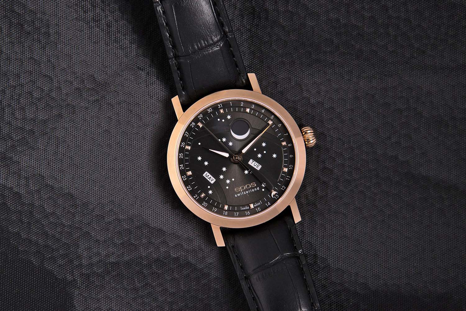 Мужские швейцарские механические часы с автоподзаводом Epos Big Moon 3440.322.24.14.25. Сапфировое стеклоСапфировое стеклоПрочный и надёжный материал из кристалла сапфира синтетического происхождения, характеризующийся особой твёрдостью и устойчивостью к царапинам и повреждениям. устойчивое к появлению царапин, обладающее высокой прозрачностью. Корпус часов изготовлен из нержавеющей стали с PVD-покрытиемPVDУльтратонкое покрытие наносится в технике вакуумного напыления, сочетает в себе нитрид титана особой прочности со слоем золота или оксида хрома. Несёт в себе декоративную или защитную функцию.. Стрелки и метки с люминесцентной подсветкойЛюминесцентное покрытиеПозволяет считывать показания времени в темноте. Производители наносят на стрелки, часовые индексы, безель или поверхность циферблата светонакопительный состав, дающий холодное свечение.. Циферблат с метками в виде точек. Дата отображается центральной стрелкой. Окошки для дня недели и месяца, индикатор фазы Луны. Часовой механизм декорирован жемчужной фактурной шлифовкой (Le Perlage). Прозрачная задняя крышка. Класс водозащиты: 50 метров, позволит защитить корпус от случайных брызг или капель дождя. Кожаный ремешок на стандартной застёжке.