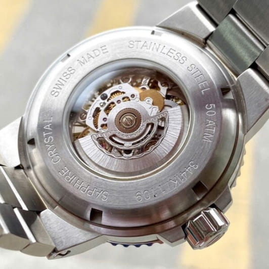 Мужские механические часы с автоподзаводом Epos из коллекции Sportive — это профессиональный дайверский инструмент с элементами скелетонизации и швейцарским качеством. Корпус диаметром 43 мм и толщиной 14 мм выполнен из нержавеющей стали 316L. Циферблат тёмно-синего цвета частично скелетонизирован, что открывает вид на сложную структуру механизма. Циферблат защищён сапфировым стекломСапфировое стеклоПрочный и надёжный материал из кристалла сапфира синтетического происхождения, характеризующийся особой твёрдостью и устойчивостью к царапинам и повреждениям.. Аппликации часовых индексов, крупные цифры и стрелки выполнены с покрытием. Стрелки и метки с люминесцентным покрытиемЛюминесцентное покрытиеПозволяет считывать показания времени в темноте. Производители наносят на стрелки, часовые индексы, безель или поверхность циферблата светонакопительный состав, дающий холодное свечение. Super-Luminova, обеспечивающим отличную читаемость в темноте. Механизм — швейцарский калибр Sellita SW200 с запасом хода 38 часов. Индикация даты реализована через скелетонизированный диск. БезельБезельВнешний ободок, закрепляющий стекло. В спортивных часах так называется поворотное кольцо с делениями на циферблате, выполняет роль таймера – замеряет отрезки времени на шкале. Неподвижный безель – элемент декора. Однонаправленно вращающийся безель на дайверских часах позволяет фиксировать моменты погружения и выныривания на поверхность. — однонаправленный вращающийся, с керамической накладкой глубокого синего цвета и рельефной шкалой погружений. Завинчивающаяся коронка и задняя крышка с прозрачным окном обеспечивают повышенную защиту и демонстрируют декор механизма. Автоматический гелиевый клапан позволяет использовать часы при профессиональном дайвинге. Часы оснащены стальным браслетом с литыми звеньями в 3 ряда и раскладной застёжкойРаскладная застёжкаТакой тип застёжки используется только на браслетах из металла. Она никогда не раскрывается полностью, происходит разделение на 2 и более частей. Раскладывающая застёжка снизит вероятность потери часов к минимуму. с двойной блокировкой и дополнительным фиксатором. Водонепроницаемость 500 м соответствует требованиям для глубоководных погружений. Гарантия — 24 месяца. Идеальный выбор для тех, кто ценит надёжность, техническое совершенство и экстремальные испытания.